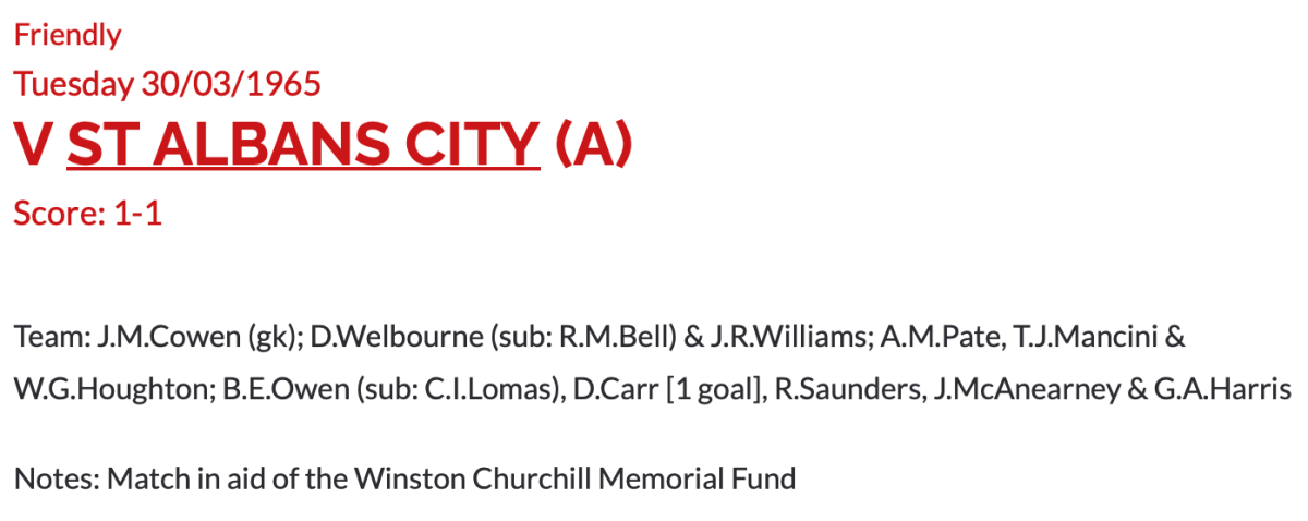 30th March 1965- Friendly, St.Albans City 1 Watford 1 https://www.watfordfcarchive.co.uk/fixture/1965-03-30 Watford Observer match report Share this: Share on X (Opens in new window) X Share on Facebook (Opens in new window) Facebook