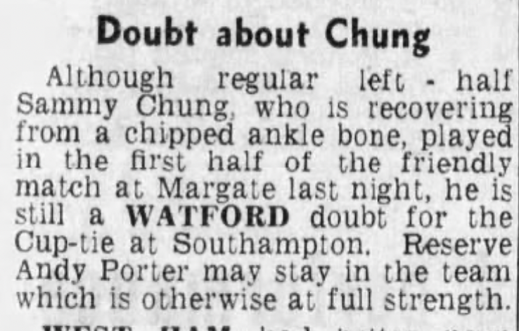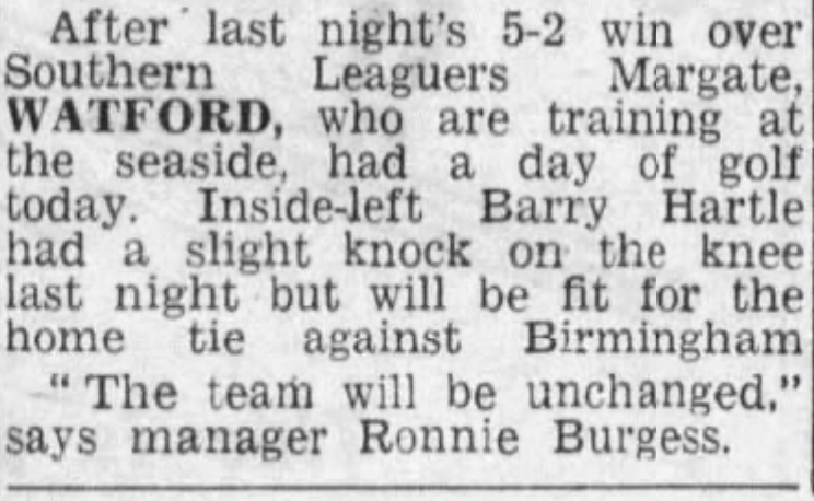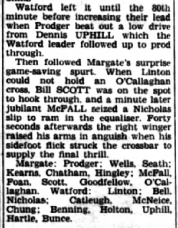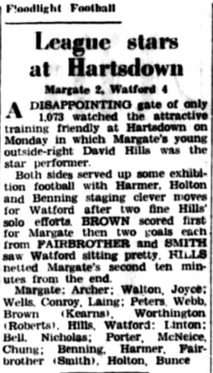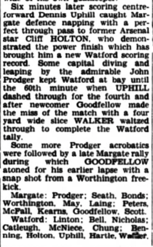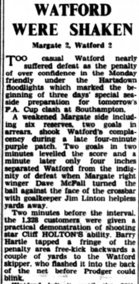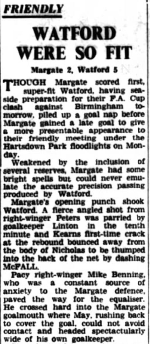21st November 1960- Friendly, Margate 2 Watford 4 https://www.watfordfcarchive.co.uk/fixture/1960-11-21 Watford Observer match report East Kent Times and Mail, 23 Nov 1960 Share this: Share on X (Opens in new window) X Share on Facebook (Opens in new window) Facebook