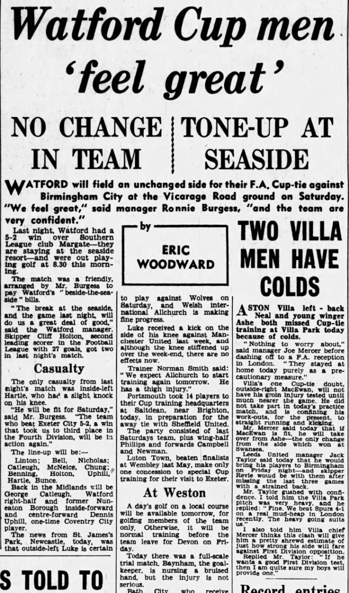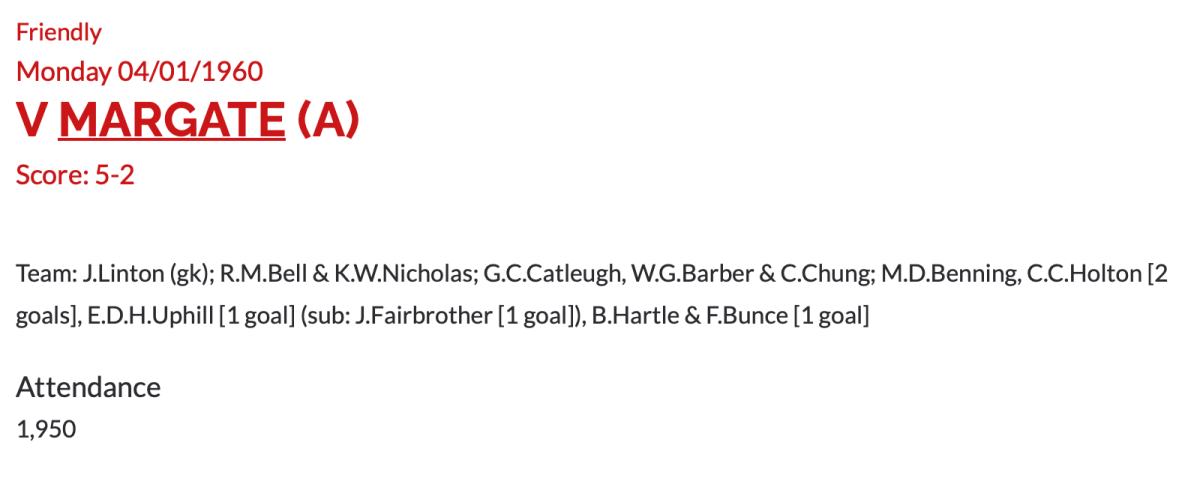 4th January 1960- Friendly, Margate 2 Watford 5 https://www.watfordfcarchive.co.uk/fixture/1960-01-04 Evening Standard, 5 Jan 1960 Birmingham Mail, 5 Jan 1960 East Kent Times and Mail, 8 Jan 1960 Share this: Share on X (Opens in new window) X Share on Facebook (Opens in new window) Facebook