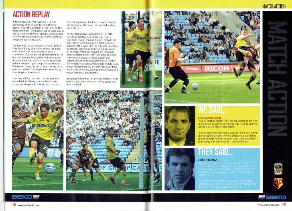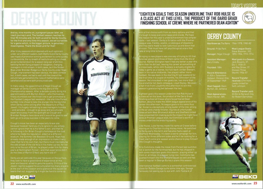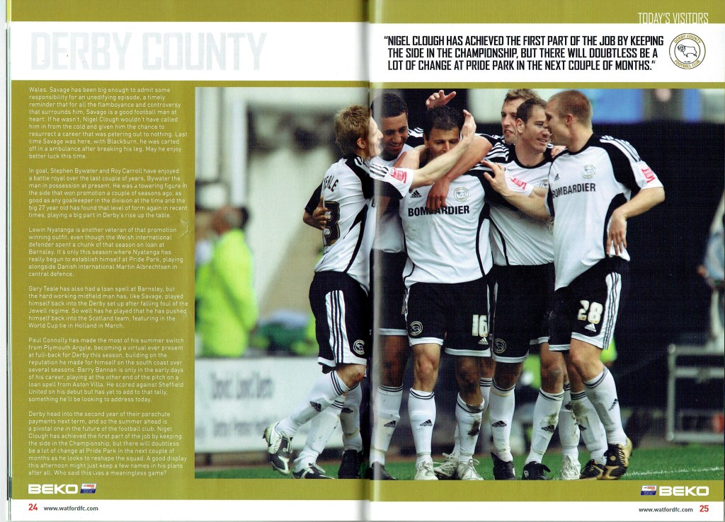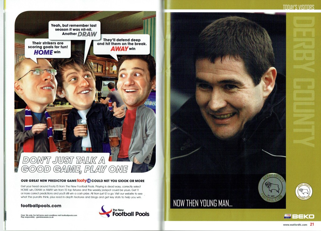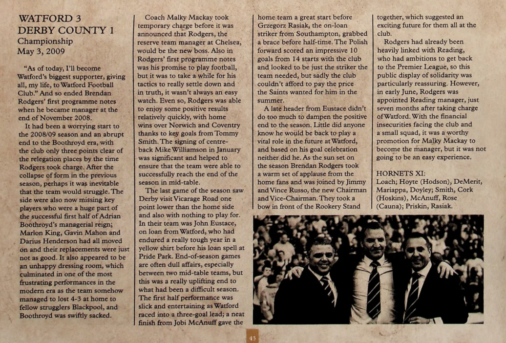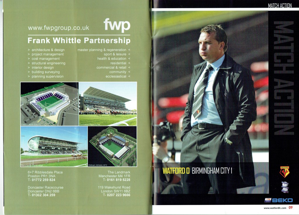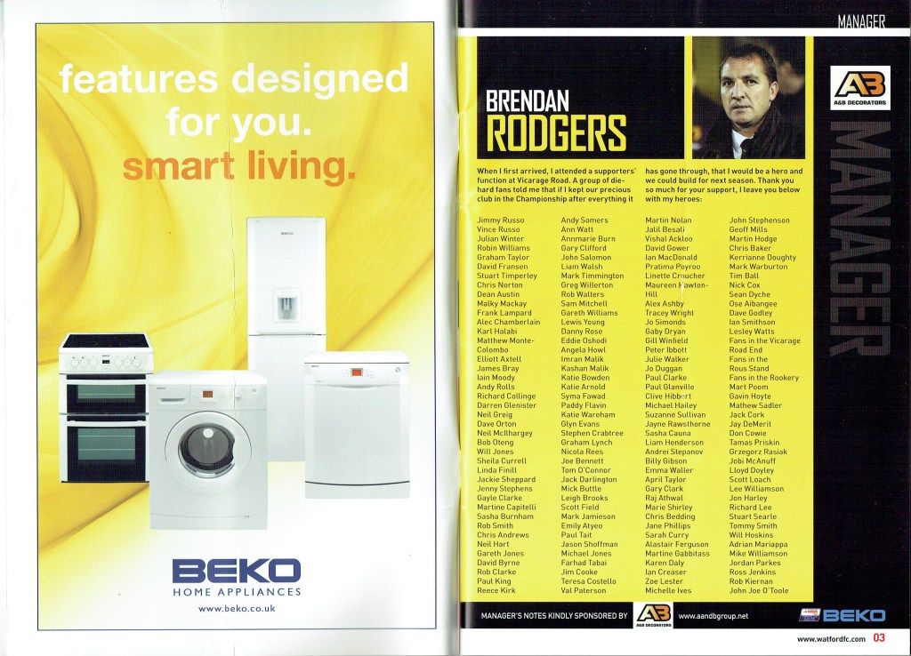 Brendan Rodgers last programme notes. This was the game where John Eustace, a Watford player but on loan to Derby, played against us and scored.