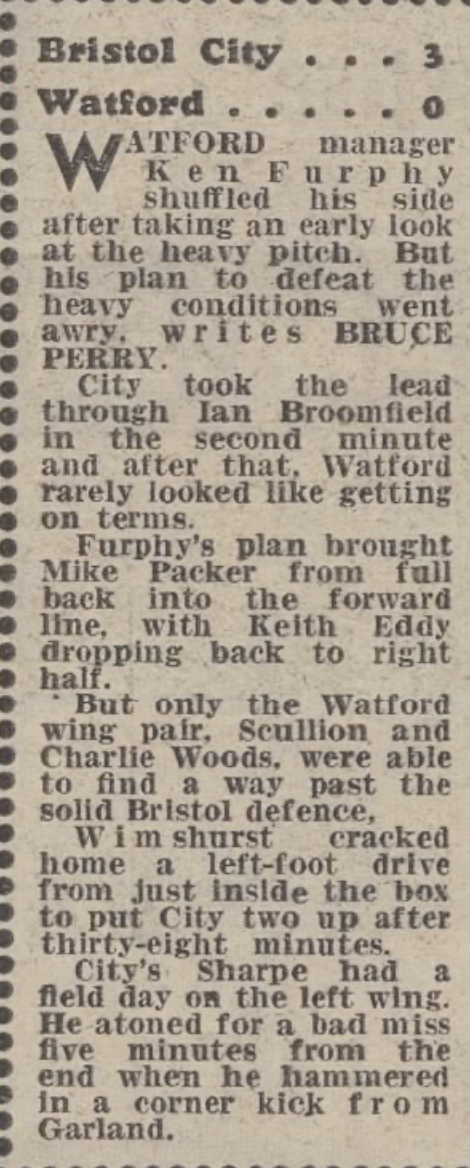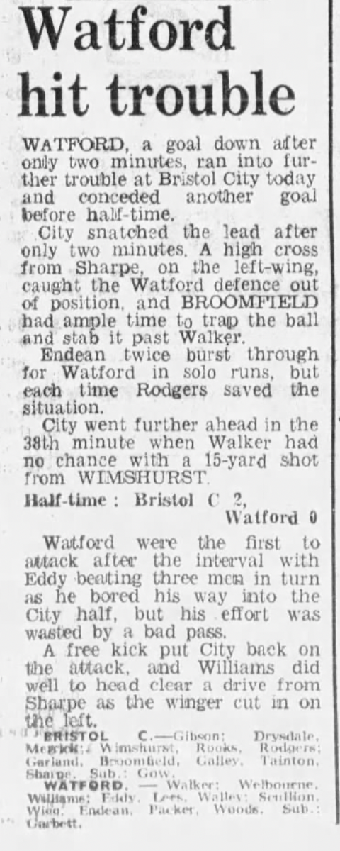 14th November 1970- Division Two, Bristol City 3 Watford 0 Leave a Reply http://watford.fcdb.info?s=37908&id=2852 Evening Standard, 14 Nov 1970 Sunday Mirror, 15 Nov 1970 Sunday People, 15 Nov 1970 Watford Observer match report https://www.soccerbase.com/matches/results.sd?date=1970-11-14 https://www.11v11.com/league-tables/league-division-two/14-november-1970/ Share this: Share on X (Opens in new window) X Share on Facebook (Opens in new window) Facebook