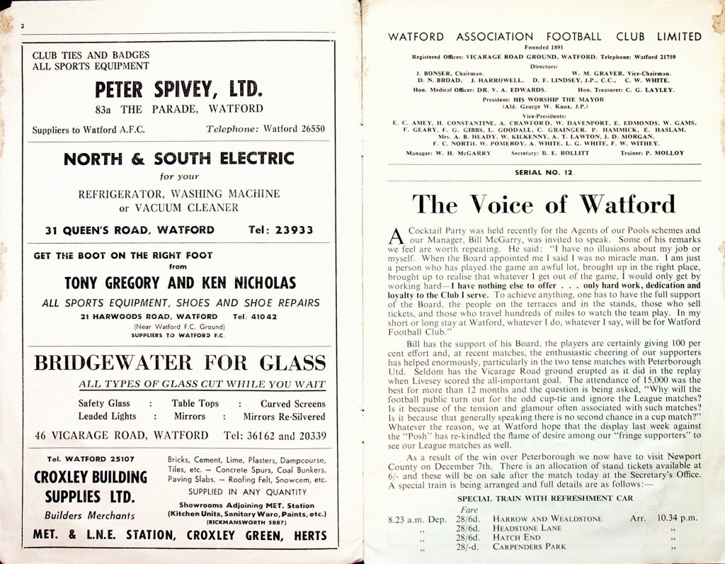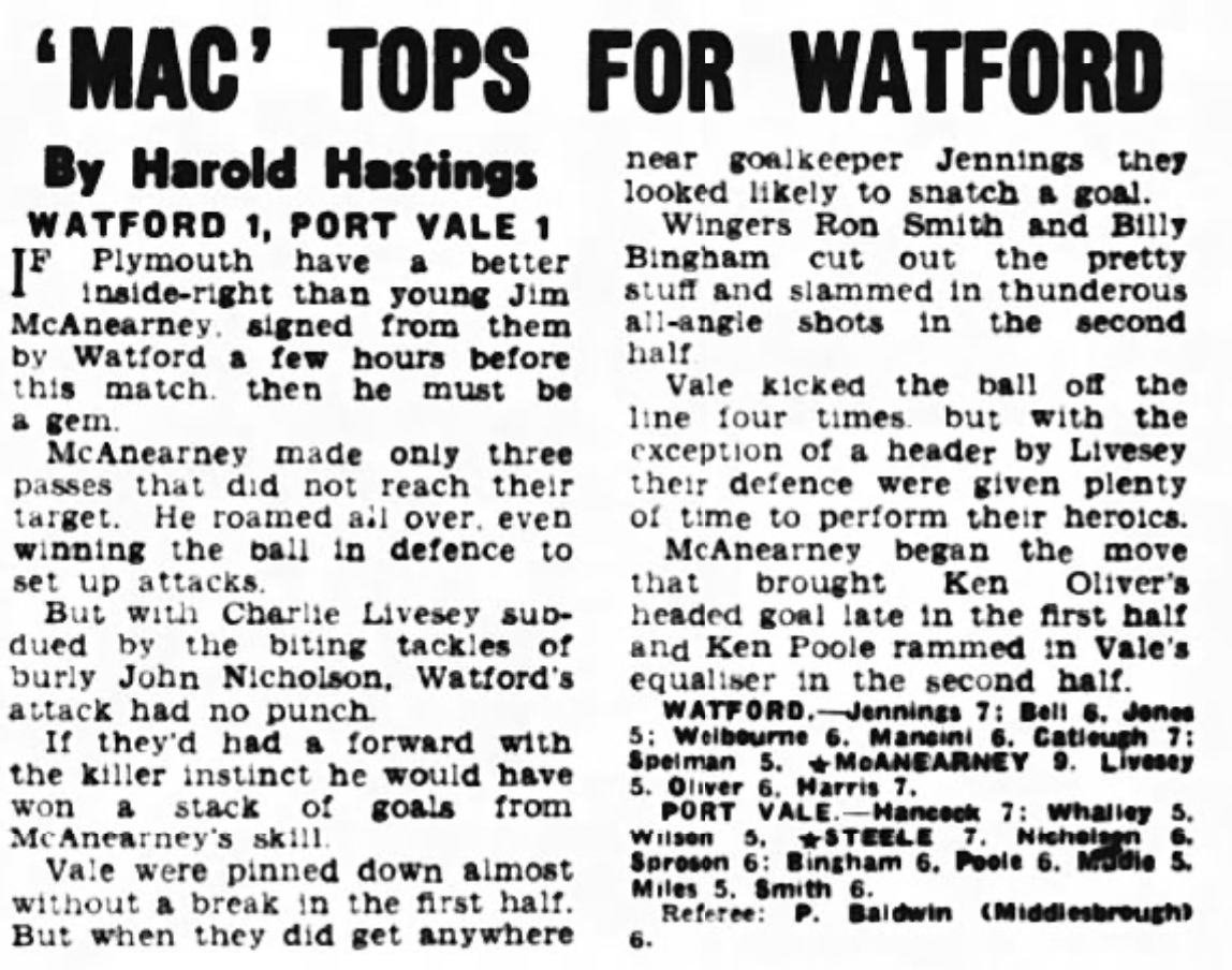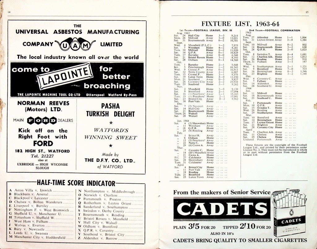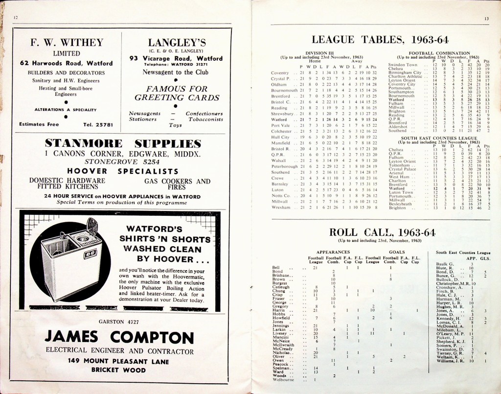 30th November 1963- Division Three, Watford 1 Port Vale 1 Leave a Reply http://watford.fcdb.info?s=40830&id=2503 Sunday People, 1 Dec 1963 Watford Observer match report https://www.11v11.com/league-tables/league-division-three/30-november-1963/ Share this: Share on X (Opens in new window) X Share on Facebook (Opens in new window) Facebook