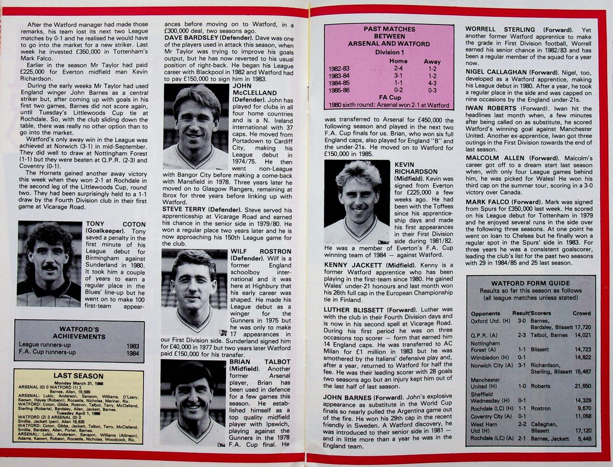 11th October 1986- Division One, Arsenal 3 Watford 1 Programme images courtesy of Matt Hall https://watford.fcdb.info/index.php?page=matches Sunday Mirror, 12 Oct 1986 Sunday People, 12 Oct 1986 Share this: Share on X (Opens in new window) X Share on Facebook (Opens in new window) Facebook