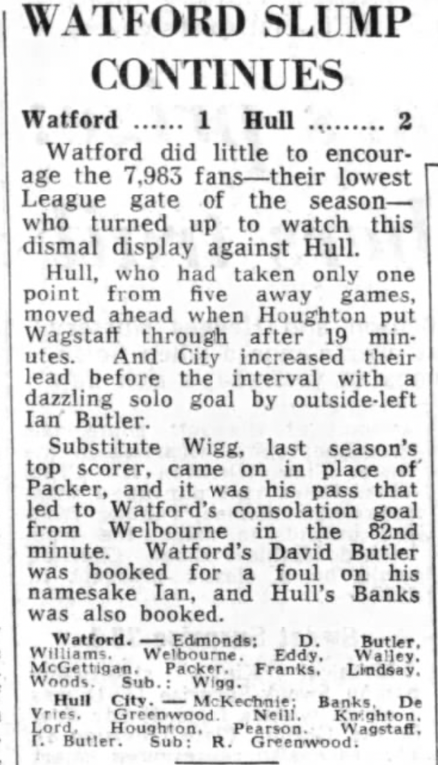 20th October 1971- Division Two, Watford 1 Hull City 2 Leave a Reply http://watford.fcdb.info?s=32570&id=2897 Daily Telegraph, 21 Oct 1971 Watford Observer match report Share this: Share on X (Opens in new window) X Share on Facebook (Opens in new window) Facebook
