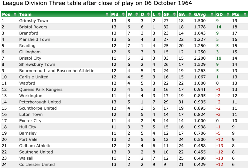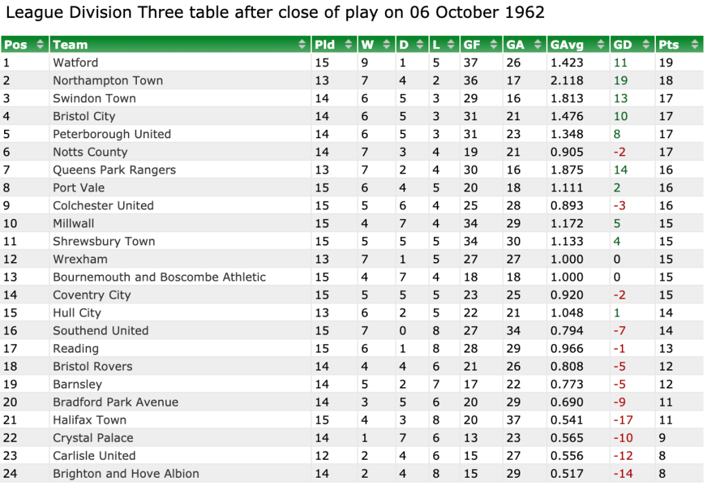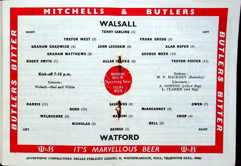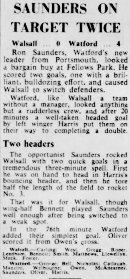 6th October 1964- Division Three, Walsall 0 Watford 4 Leave a Reply http://watford.fcdb.info?id=2541 Daily Mirror, 7 Oct 1964 Daily Telegraph, 7 Oct 1964 Watford Observer match report https://www.soccerbase.com/matches/results.sd?date=1964-10-06 https://www.11v11.com/league-tables/league-division-three/06-october-1964/ Share this: Share on X (Opens in new window) X Share on Facebook (Opens in new window) Facebook