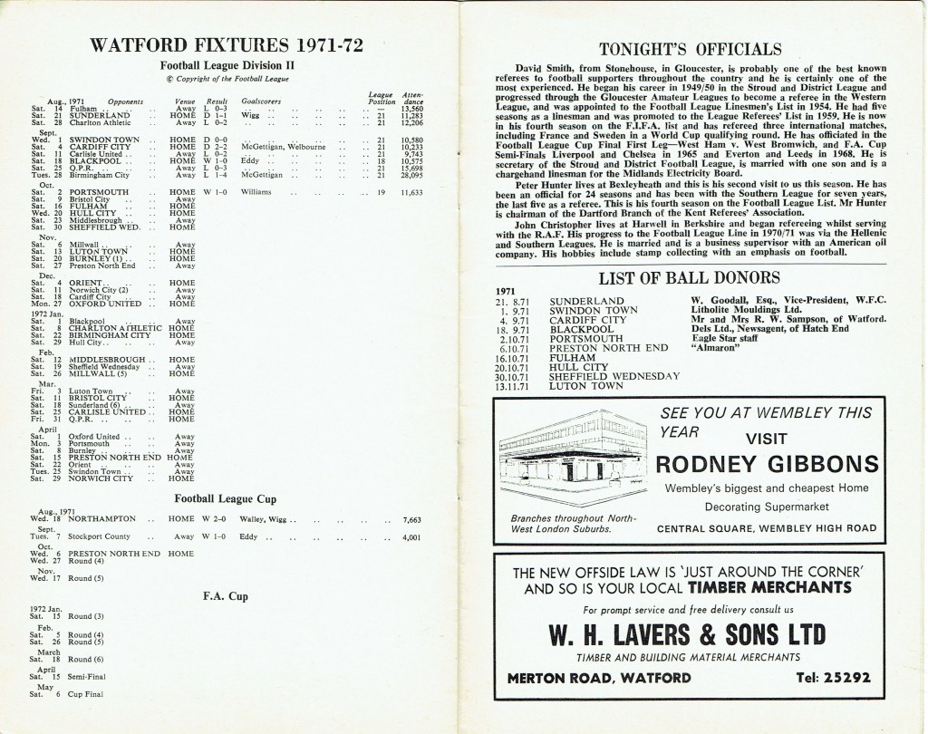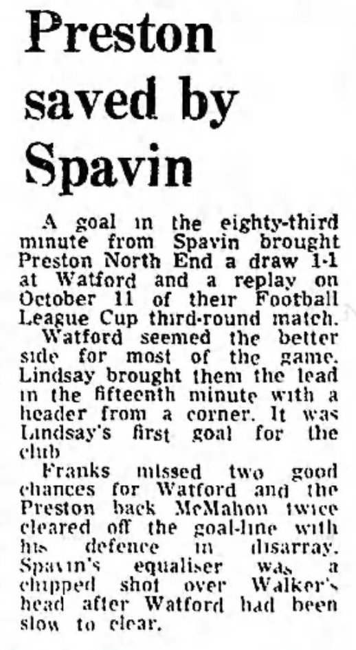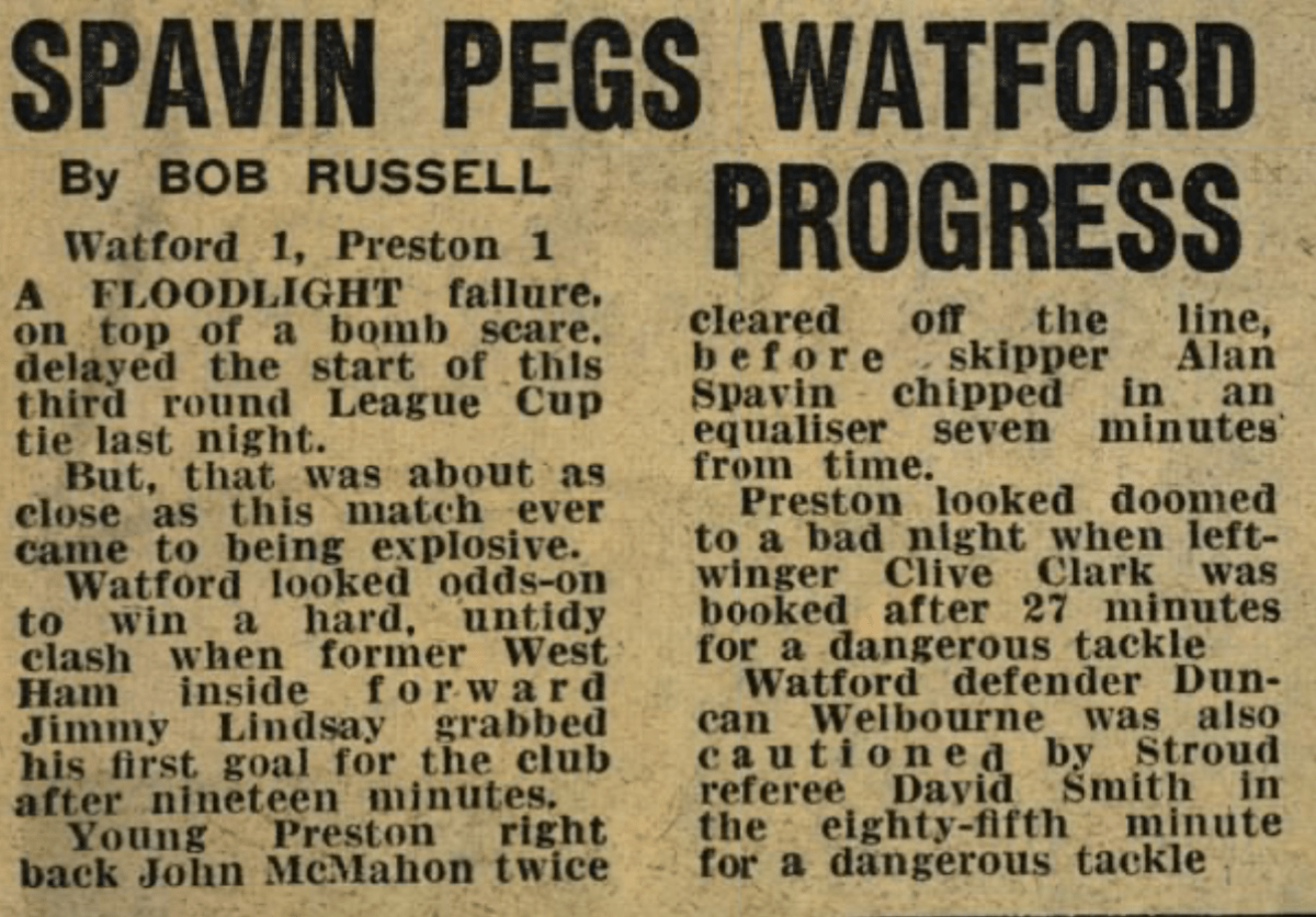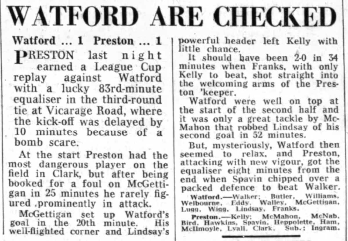 6th October 1971- League Cup Third Round, Watford 1 Preston North End 1 Leave a Reply The start of the game was delayed by 10 minutes because of a bomb scare. http://watford.fcdb.info?id=2893 Daily Mirror, 7 Oct 1971 Daily Telegraph, 7 Oct 1971 The Guardian, 7 Oct 1971 Watford Observer match report Share this: Share on X (Opens in new window) X Share on Facebook (Opens in new window) Facebook