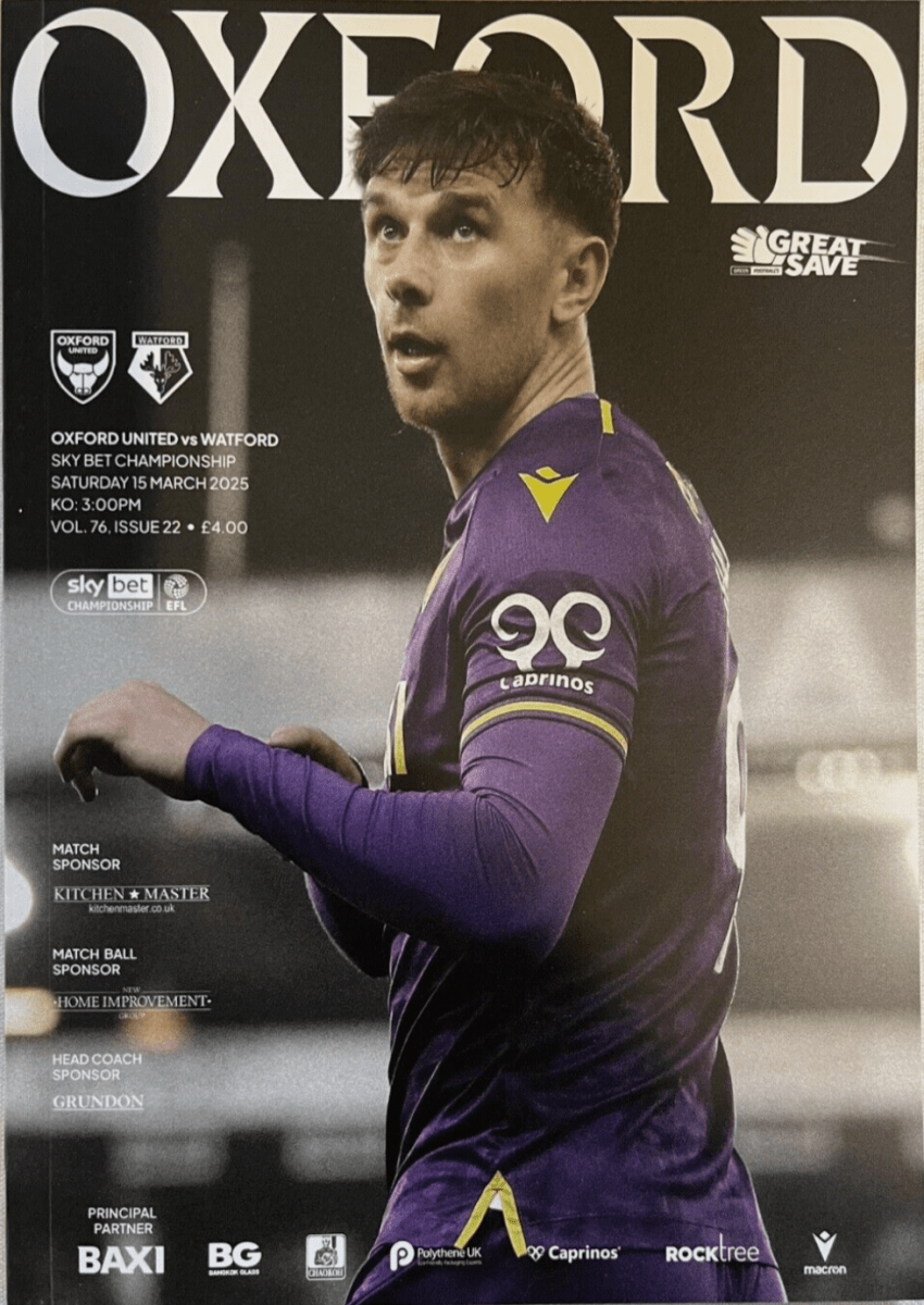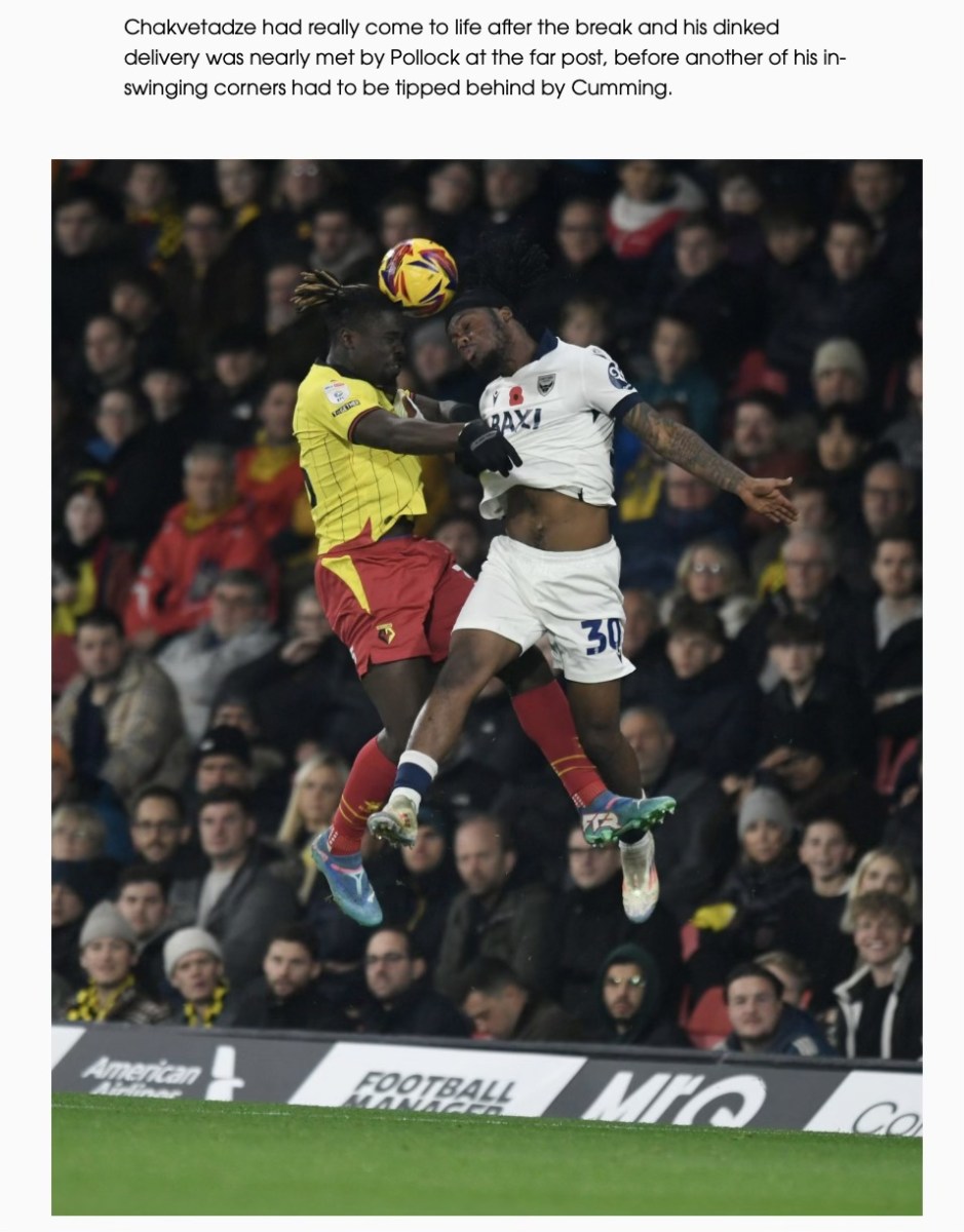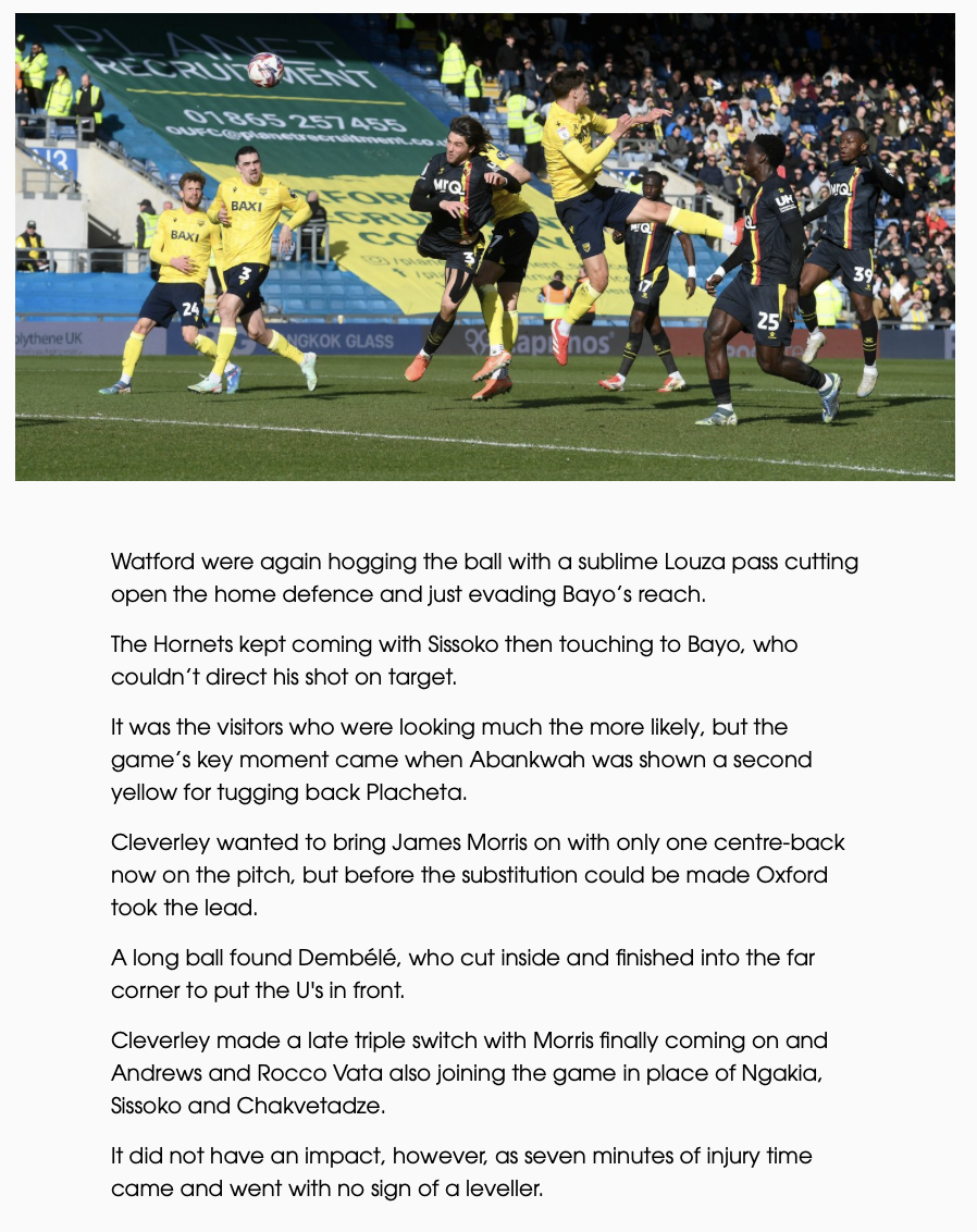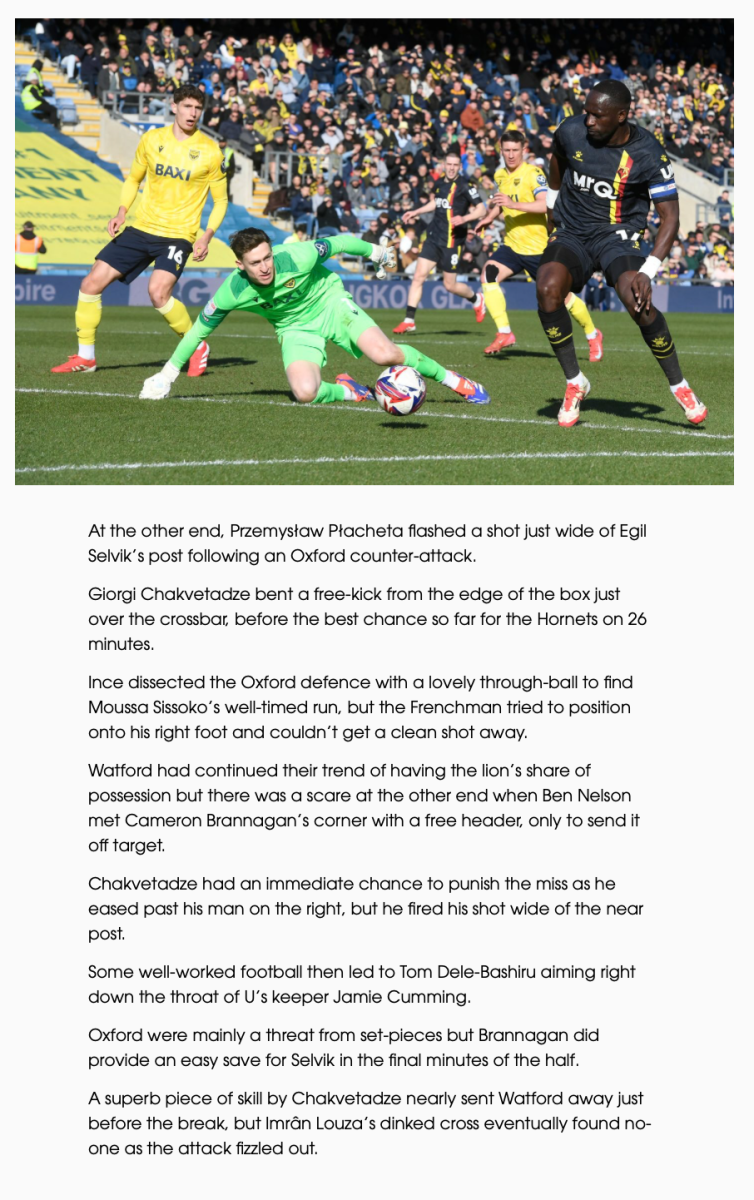 Momentum started shifting towards the Hornets as they approached the hour-mark. A fine Marc Navarro pass unlocked the Oxford defence, allowing Perica a clear run at goal, but his shot struck the face of Stevens and Sema’s left-footed follow-up flew high into the car park behind the keeper’s goal.