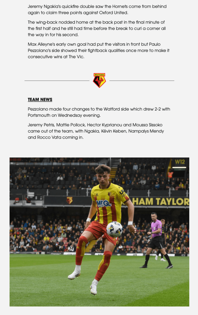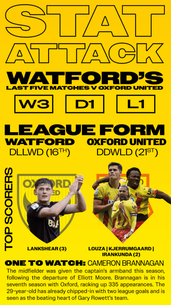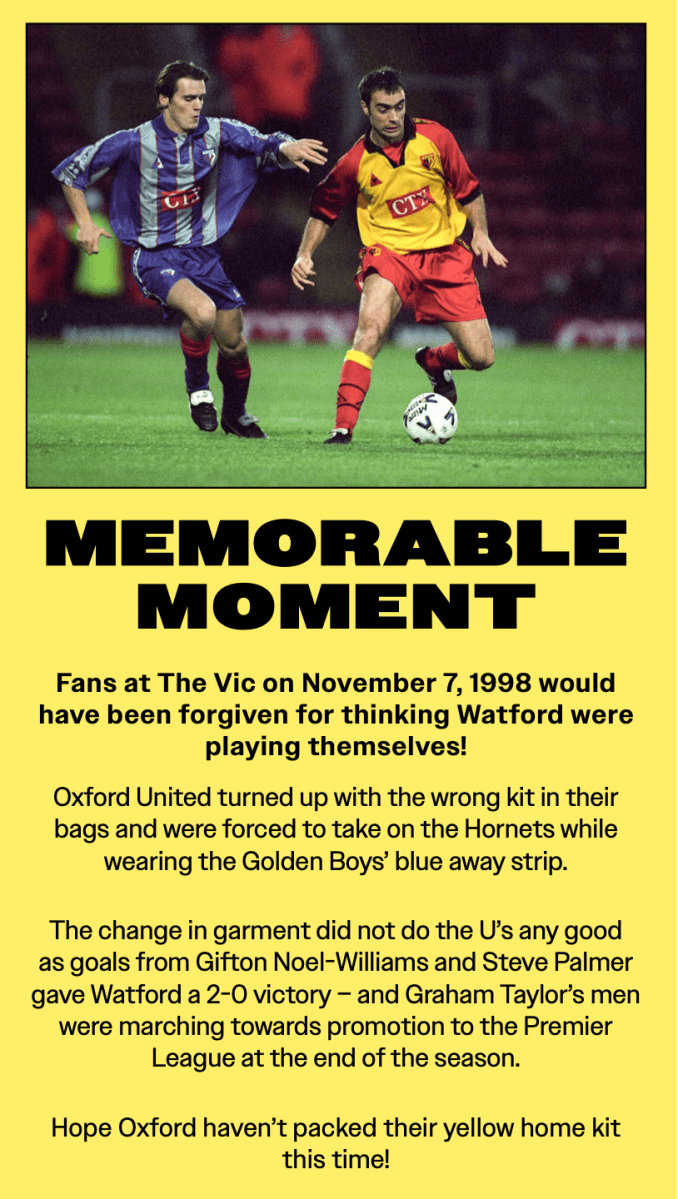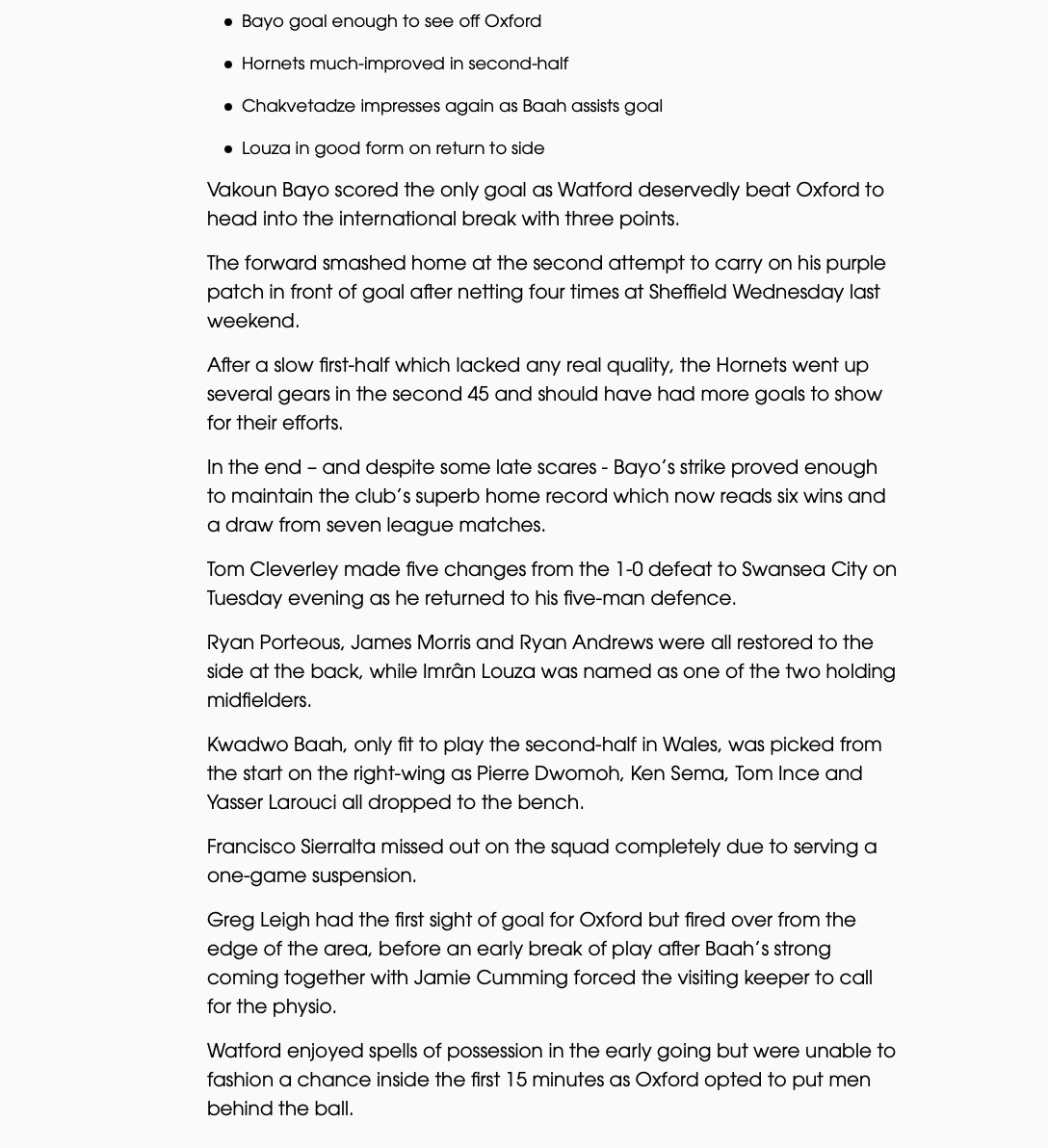 Momentum started shifting towards the Hornets as they approached the hour-mark. A fine Marc Navarro pass unlocked the Oxford defence, allowing Perica a clear run at goal, but his shot struck the face of Stevens and Sema’s left-footed follow-up flew high into the car park behind the keeper’s goal.