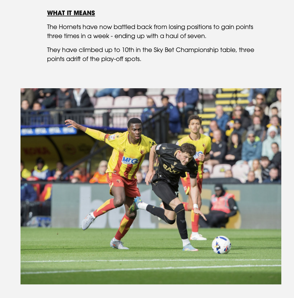 If Watford were to find a way back into the game they were going to have to do it the hard way. Navarro pulled up with what looked like a hamstring injury and with three replacements already made, the Hornets were left to navigate the final 20 minutes with just 10 men.