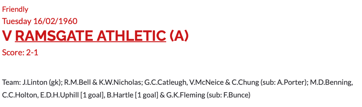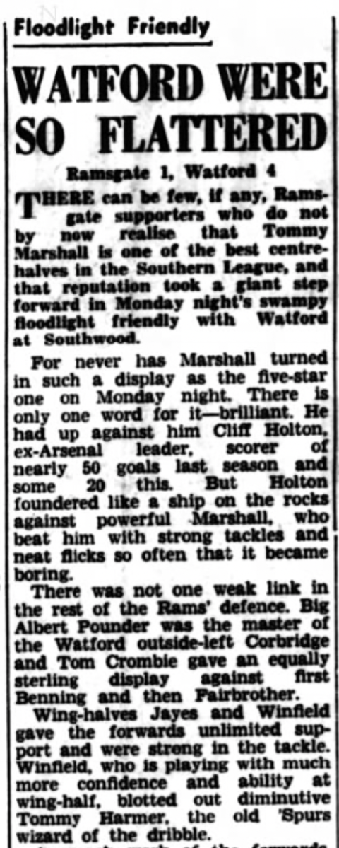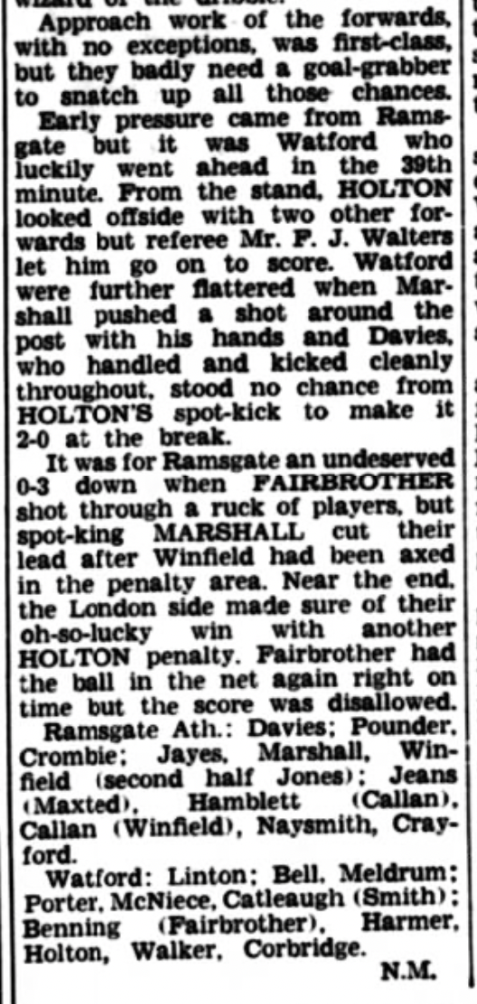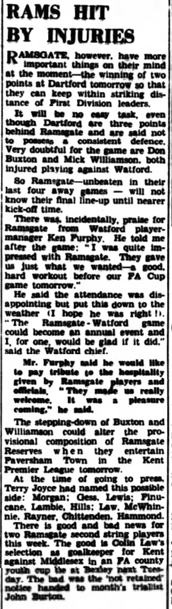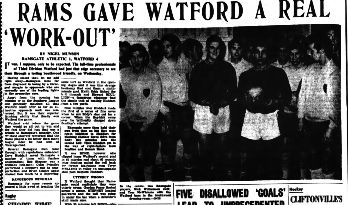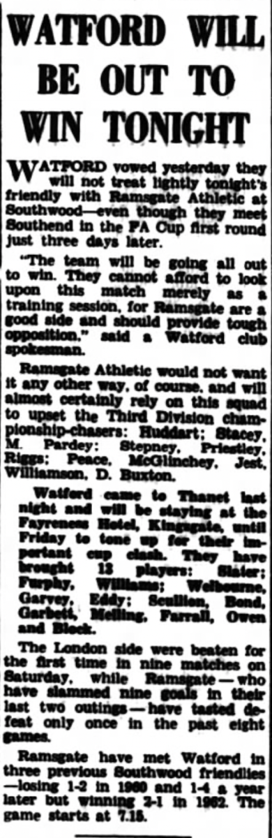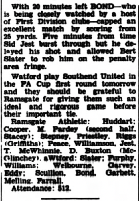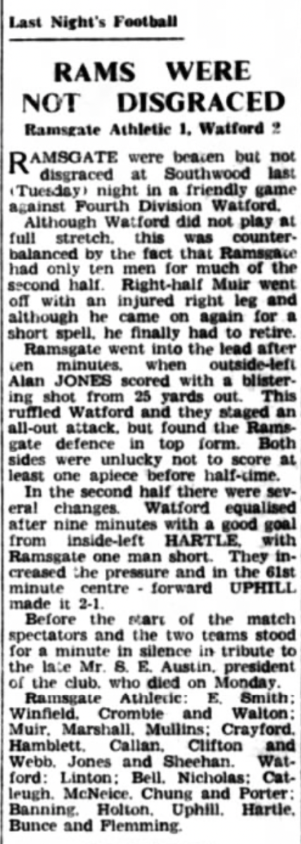 16th February 1960- Friendly, Ramsgate Athletic 1 Watford 2 https://www.watfordfcarchive.co.uk/fixture/1960-02-16 East Kent Times and Mail, 17 Feb 1960 Share this: Click to share on X (Opens in new window) X Click to share on Facebook (Opens in new window) Facebook
