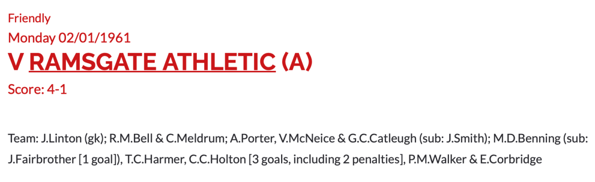 2nd January 1961- Friendly, Ramsgate Athletic 1 Watford 4 http://watford.fcdb.info/index.php?page=matches Watford Observer match report East Kent Times & Mail, 3 Jan 1961 Share this: Click to share on X (Opens in new window) X Click to share on Facebook (Opens in new window) Facebook