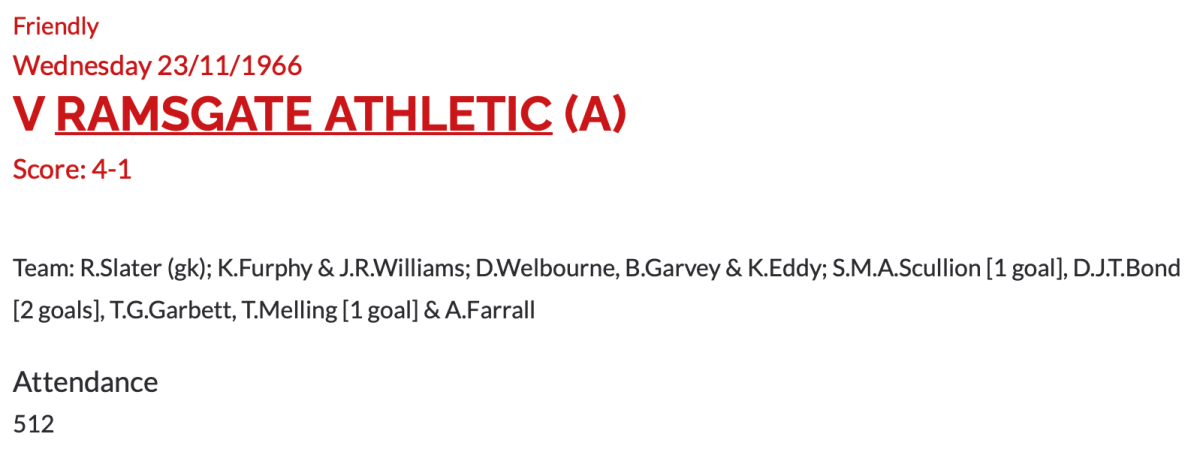20th November 1962- Friendly, Ramsgate Athletic 2 Watford 1 https://www.watfordfcarchive.co.uk/fixture/1962-11-20 East Kent Times and Mail, 23 Nov 1962 Watford Observer match report Share this: Click to share on X (Opens in new window) X Click to share on Facebook (Opens in new window) Facebook