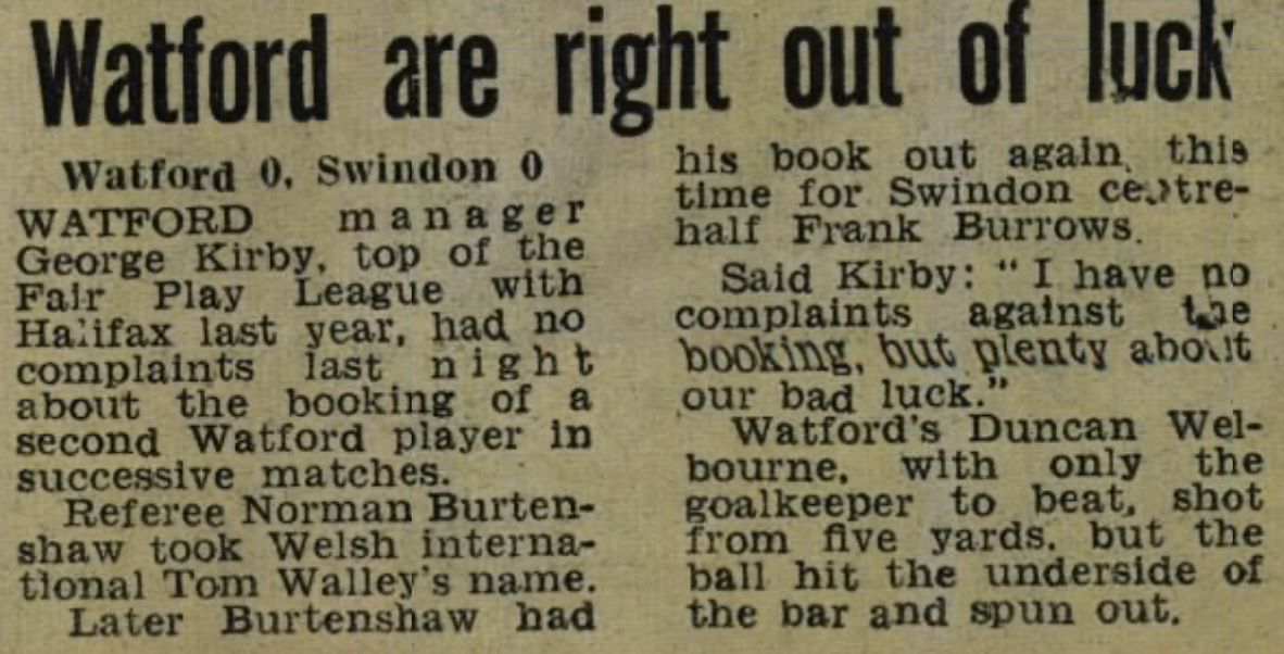 1st September 1971- Division Two, Watford 0 Swindon Town 0 Leave a Reply http://watford.fcdb.info?id=2885 Daily Mirror, 2 Sep 1971 Daily Telegraph, 2 Sep 1971 Watford Observer match report Share this: Share on X (Opens in new window) X Share on Facebook (Opens in new window) Facebook