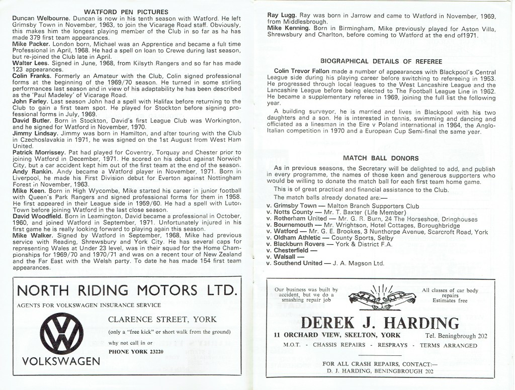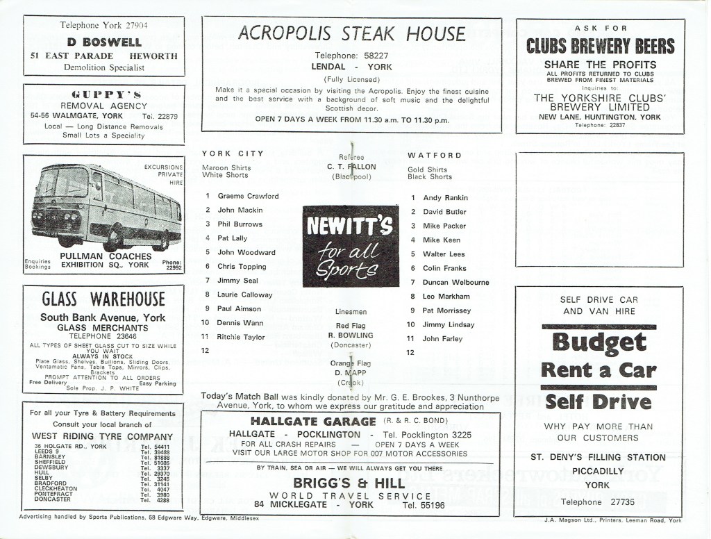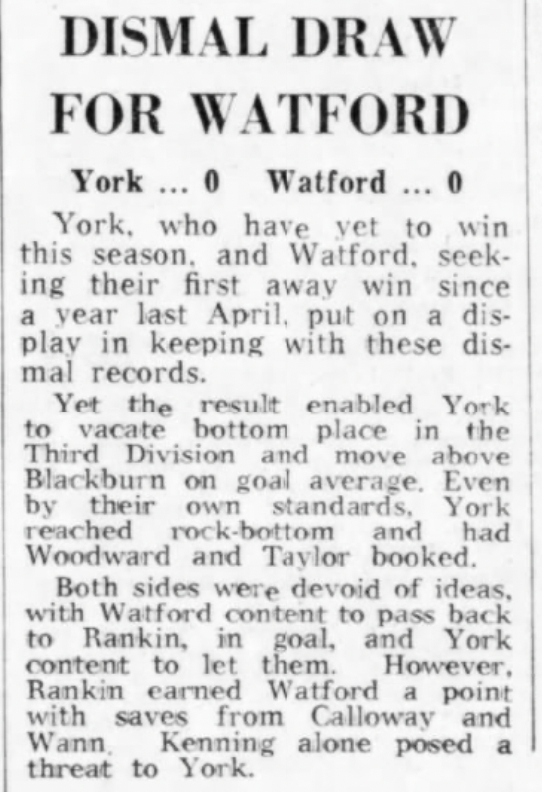18th September 1972- Division Three, York City 0 Watford 0 Leave a Reply http://watford.fcdb.info/index.php?page=matches Daily Mirror, 19 Sep 1972 Daily Telegraph, 19 Sep 1972 Watford Observer match report Share this: Share on X (Opens in new window) X Share on Facebook (Opens in new window) Facebook