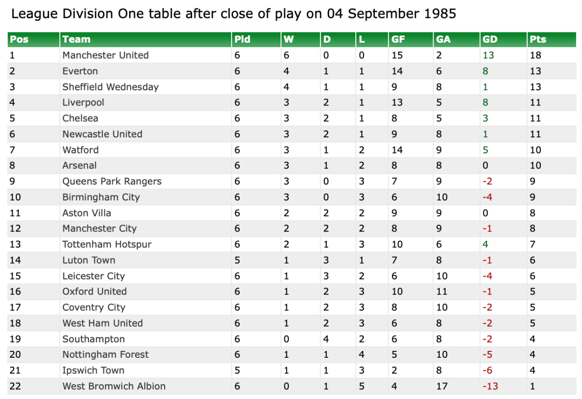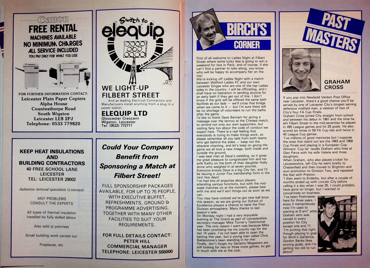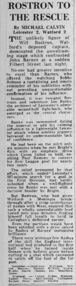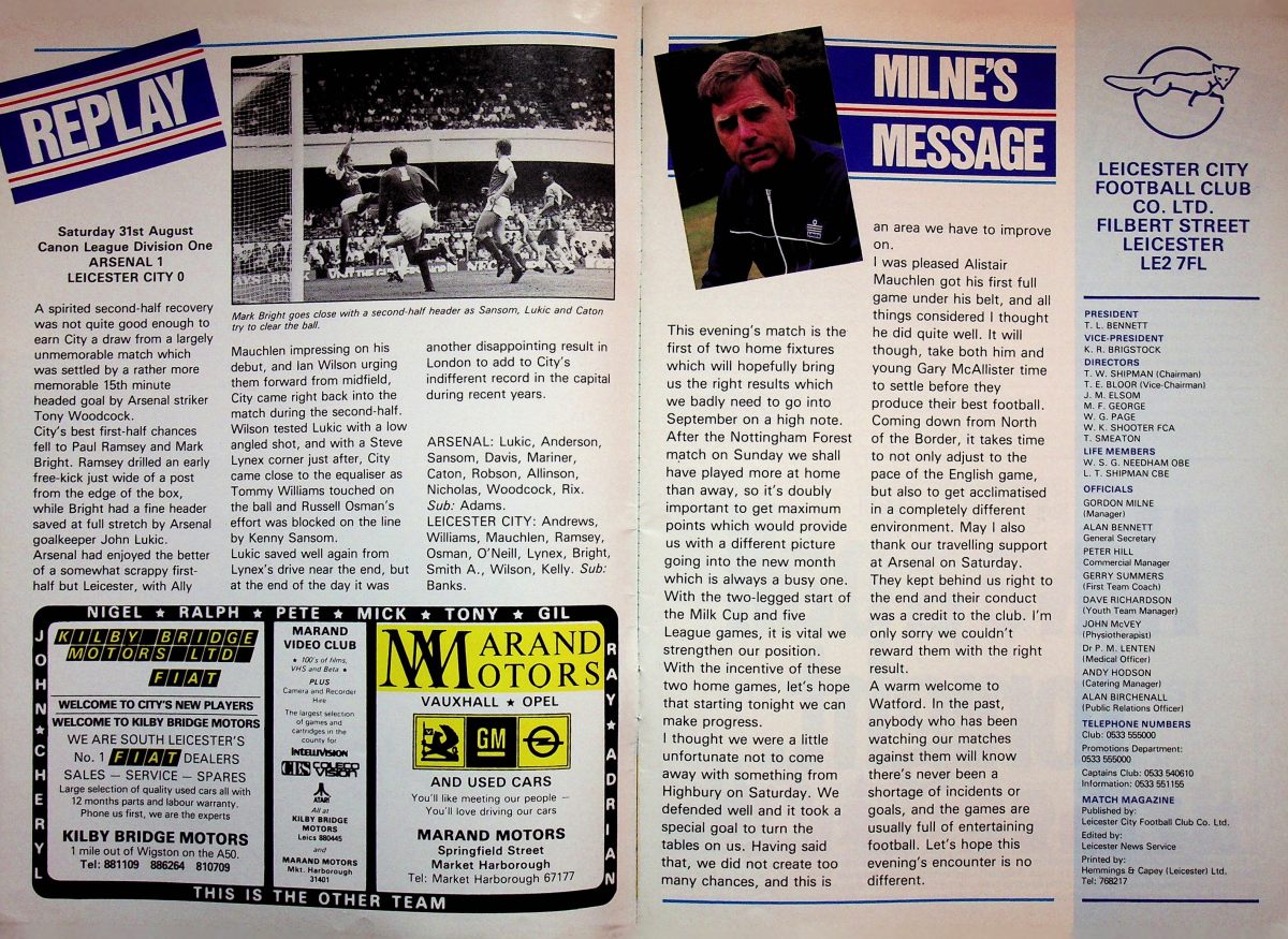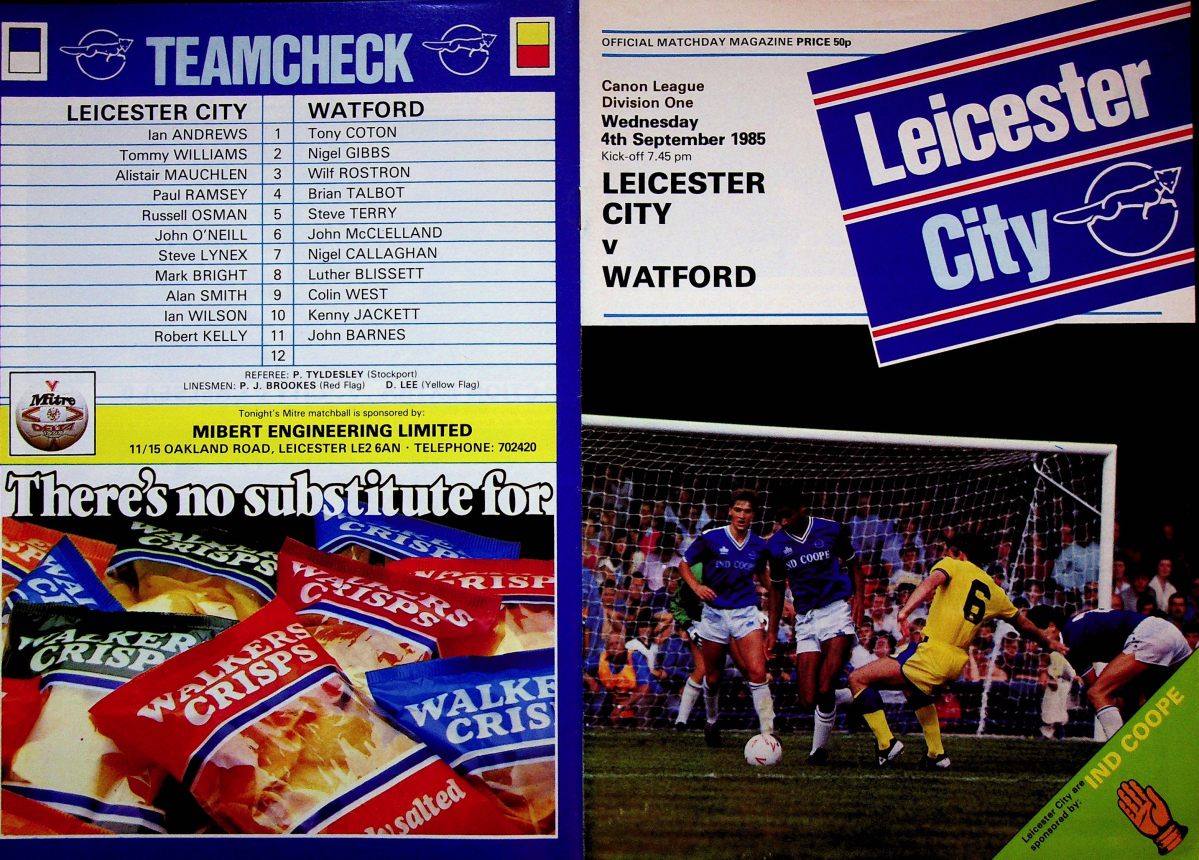 4th September 1985- Division One, Leicester City 2 Watford 2 Programme images courtesy of Matt Hall https://watford.fcdb.info/index.php?page=matches Daily Mirror, 5 Sep 1985 https://www.11v11.com/league-tables/league-division-one/04-september-1985/ Share this: Share on X (Opens in new window) X Share on Facebook (Opens in new window) Facebook