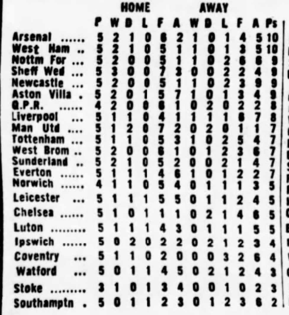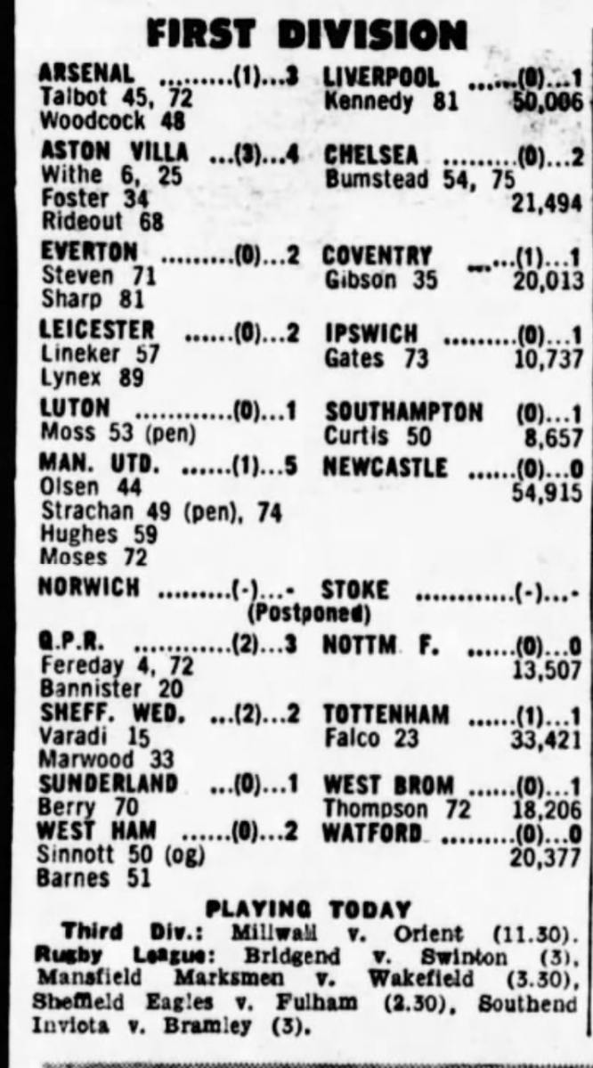 8th September 1979- Division Two, Bristol Rovers 1 Watford 1 Leave a Reply https://watford.fcdb.info?id=3298&s=165174&p=1 Watford Observer match report Sunday Mirror, 9 Sep 1979 Sunday People, 9 Sep 1979 https://www.soccerbase.com/matches/results.sd?date=1979-09-08 https://www.11v11.com/league-tables/league-division-two/08-september-1979/ Share this: Share on X (Opens in new window) X Share on Facebook (Opens in new window) Facebook