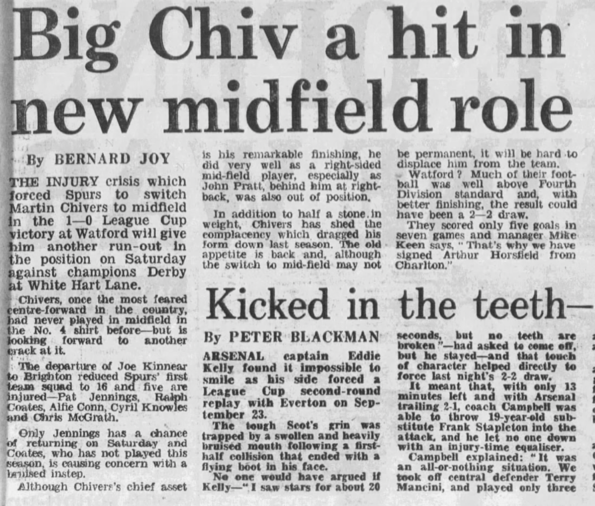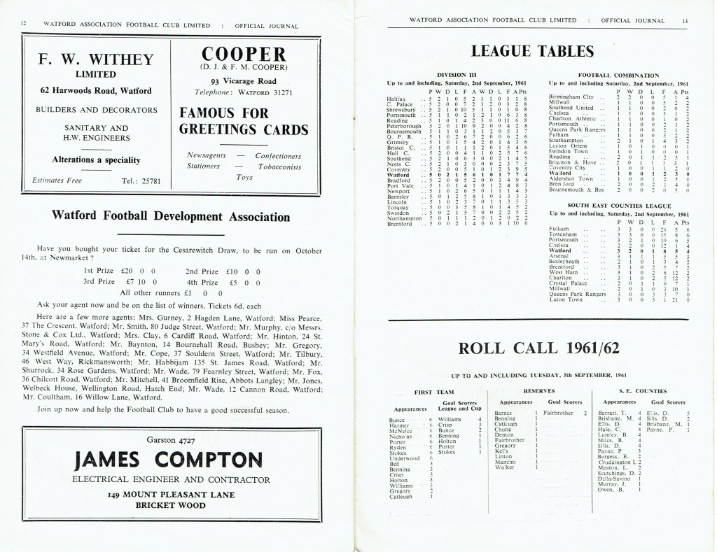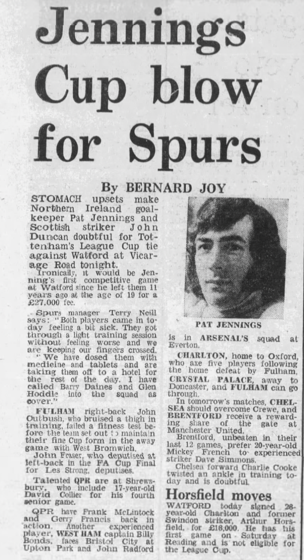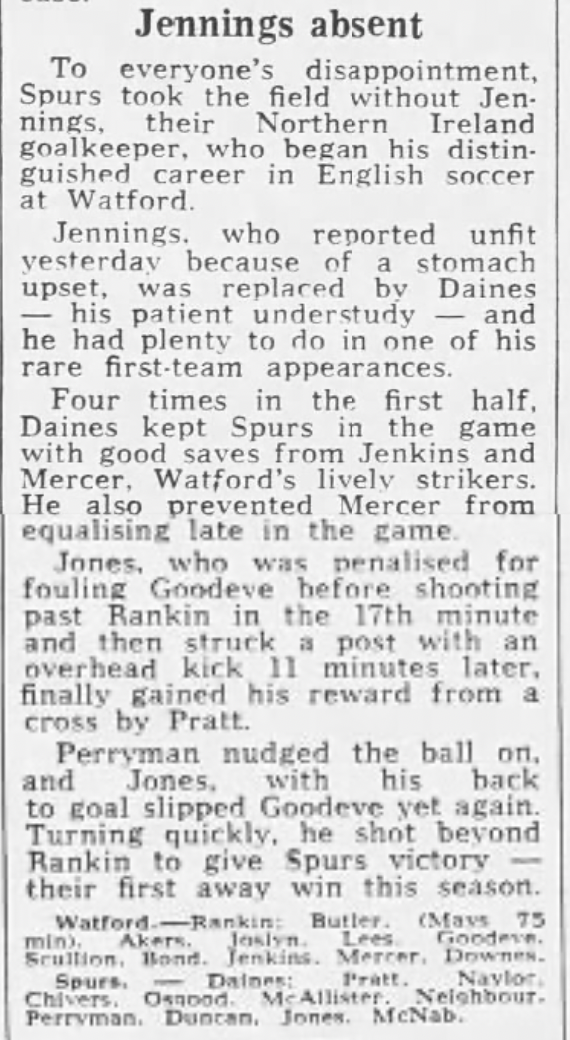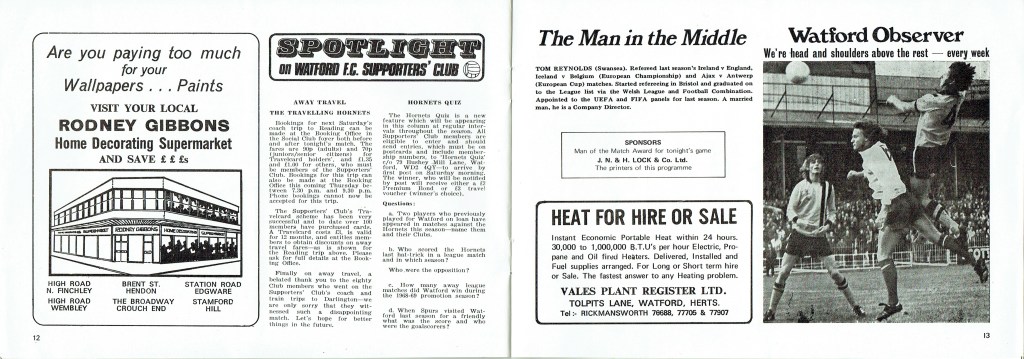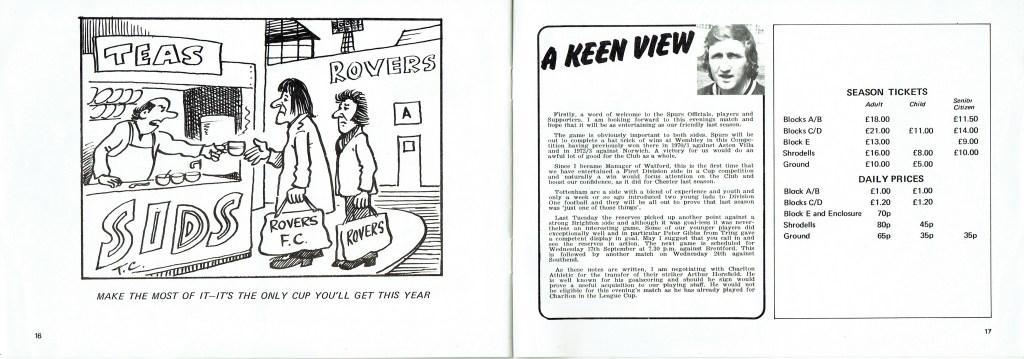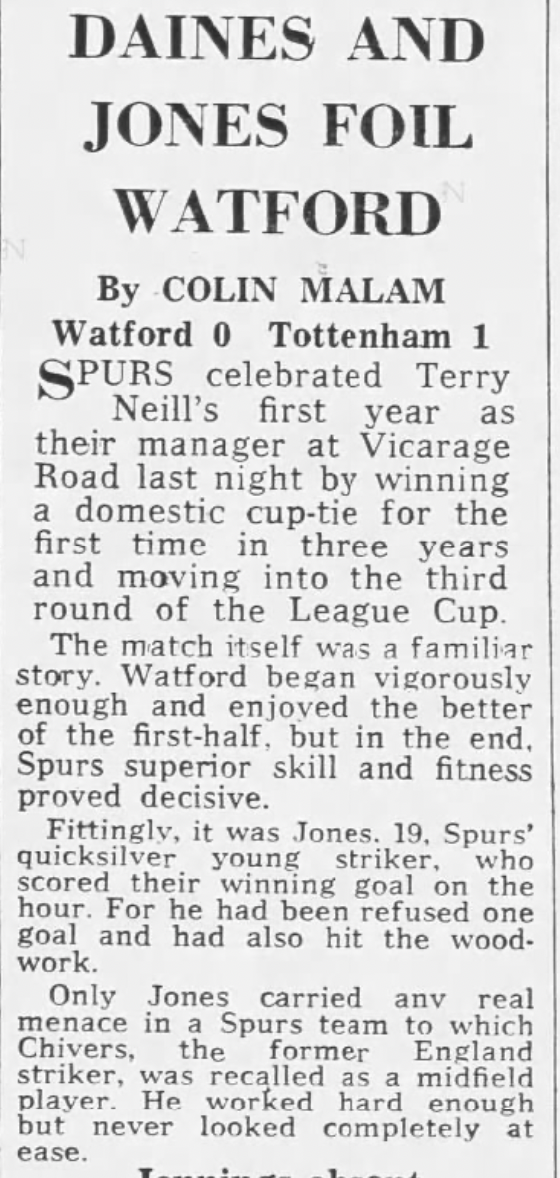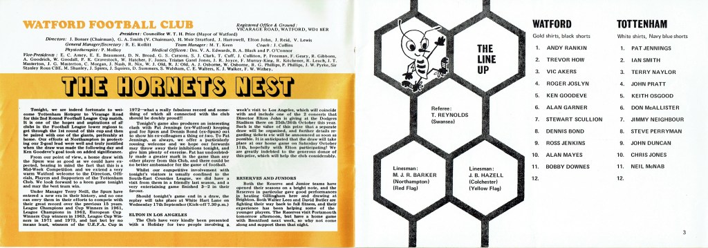 9th September 1975- League Cup Second Round, Watford 0 Tottenham Hotspur 1 Leave a Reply Evening Standard, 9 Sep 1975 http://watford.fcdb.info?id=3083 Daily Telegraph, 10 Sep 1975 Evening Standard, 10 Sep 1975 Watford Observer match report 15th September 2001-New Division One, Watford 1 West Bromwich Albion 2 Share this: Share on X (Opens in new window) X Share on Facebook (Opens in new window) Facebook