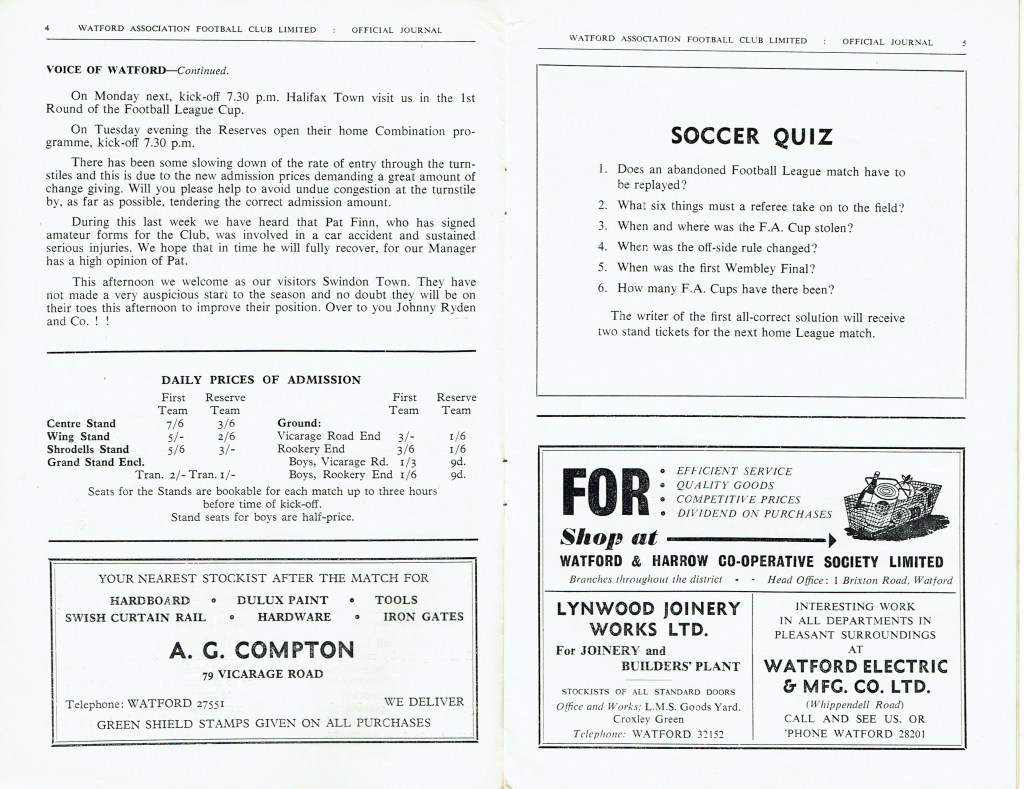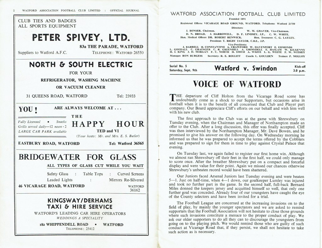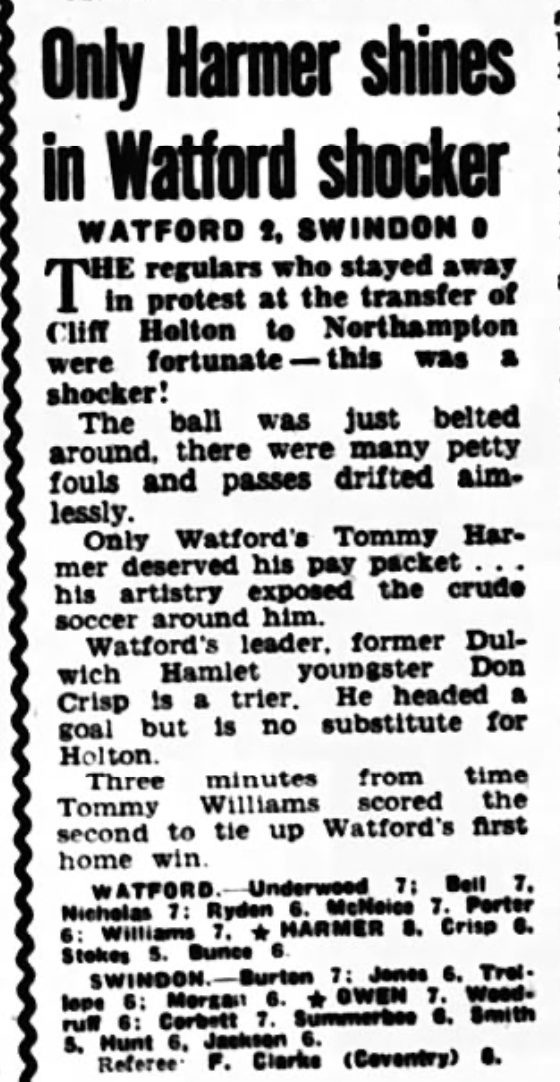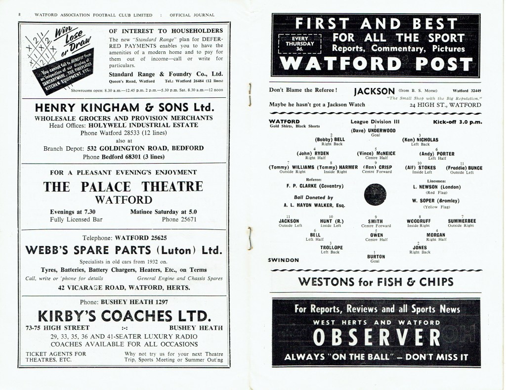 9th September 1961- Division Three, Watford 2 Swindon Town 0 Leave a Reply http://watford.fcdb.info?id=2379 Sunday People, 10 Sep 1961 Watford Observer match report Share this: Share on X (Opens in new window) X Share on Facebook (Opens in new window) Facebook