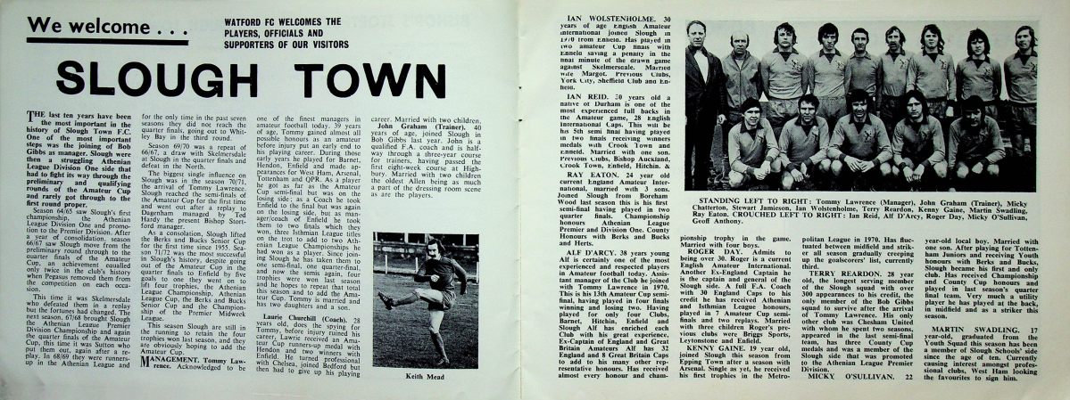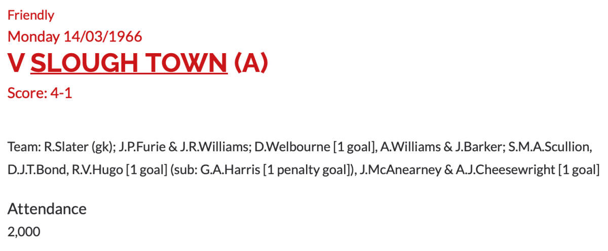 14th March 1966- Friendly, Slough Town 1 Watford 4 https://www.watfordfcarchive.co.uk/fixture/1966-03-14 Watford Observer match report Share this: Share on X (Opens in new window) X Share on Facebook (Opens in new window) Facebook