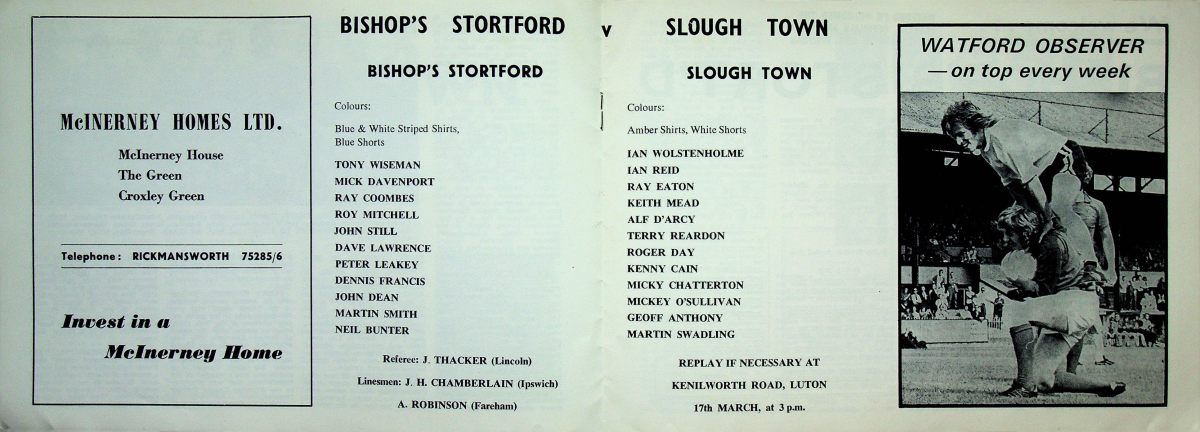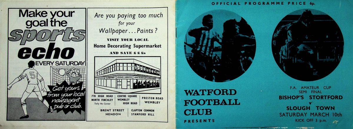 10th March 1973- FA Amateur Cup Semi Final, Bishops Stortford 0 Slough Town 1 (played at Vicarage Road) Sunday Mirror, 11 Mar 1973 Sunday Sun, 11 Mar 1973 Programme images courtesy of Matt Hall Share this: Share on X (Opens in new window) X Share on Facebook (Opens in new window) Facebook