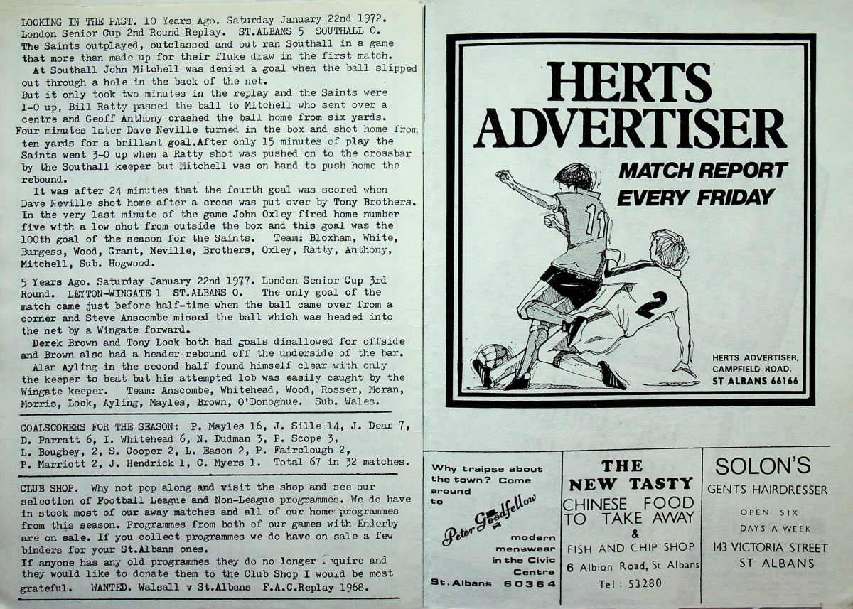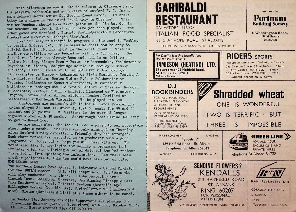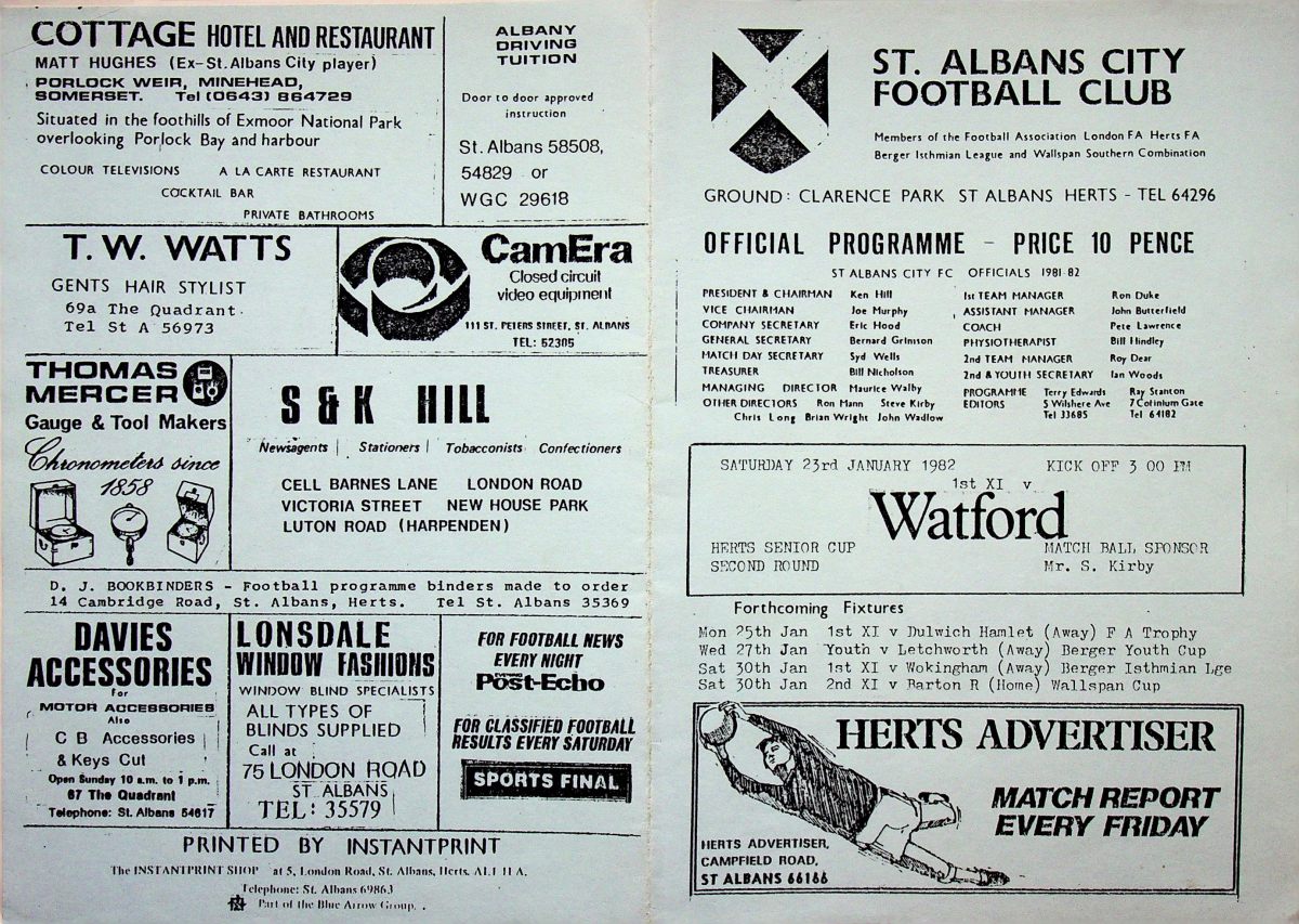 23rd January 1982- Herts Senior Cup Second Round, St.Albans City 1 Watford 3 Programme images courtesy of Matt Hall https://oldwatford.com/1982/02/20/20th-february-1982-division-two-watford-1-luton-town-1/ Share this: Share on X (Opens in new window) X Share on Facebook (Opens in new window) Facebook