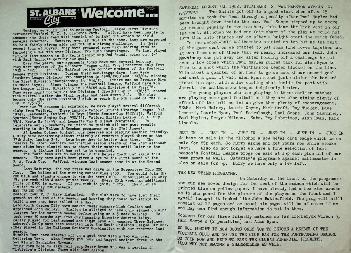 10th August 1982- Friendly, St.Albans City v Watford Programme images courtesy of Matt Hall Share this: Share on X (Opens in new window) X Share on Facebook (Opens in new window) Facebook