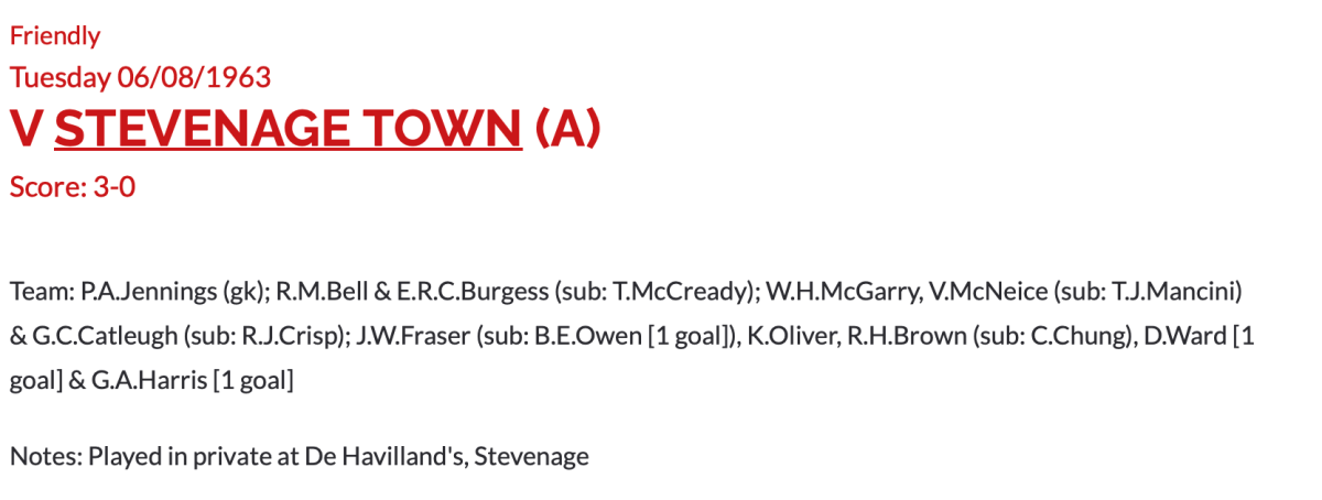 6th August 1963- Friendly, Stevenage Town 0 Watford 3 https://www.watfordfcarchive.co.uk/fixture/1963-08-06 Share this: Share on X (Opens in new window) X Share on Facebook (Opens in new window) Facebook