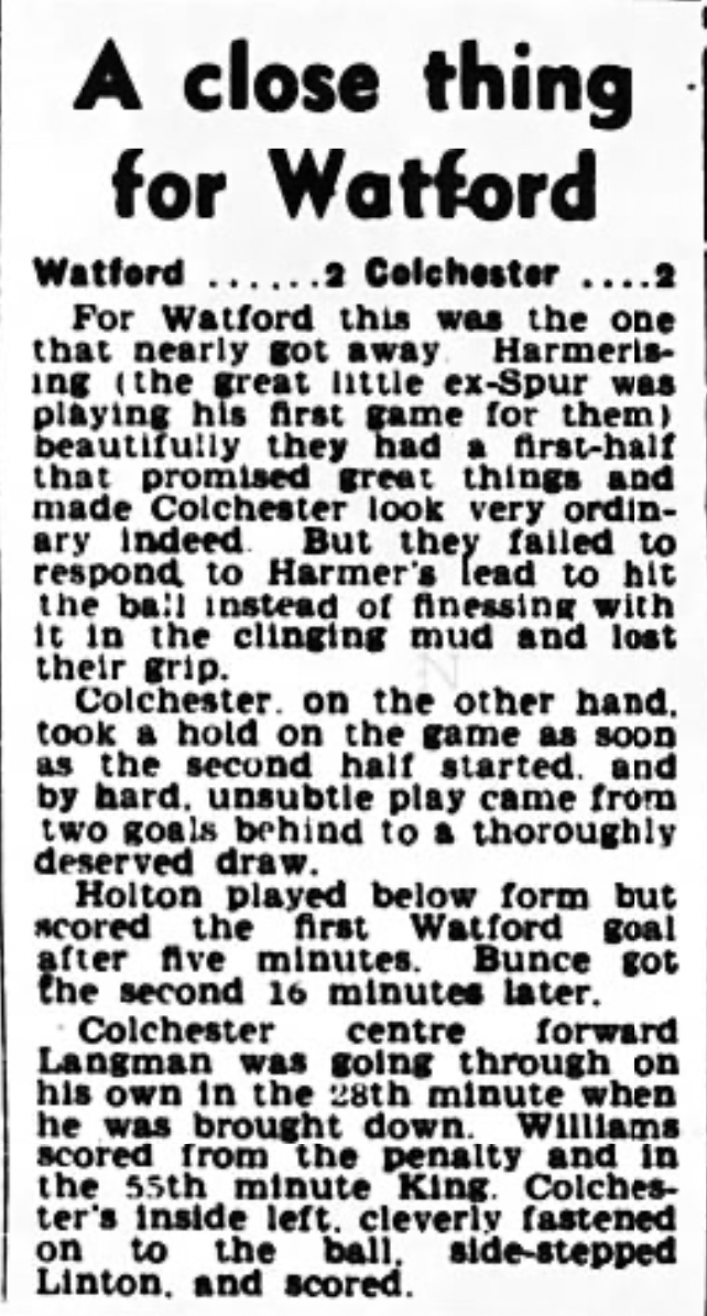 29th October 1960- Division Three, Watford 2 Colchester United 2 Leave a Reply http://watford.fcdb.info?s=34646&id=2338 Watford Observer match report Sunday People, 30 Oct 1960 Sunday Dispatch, 30 Oct 1960 Share this: Share on X (Opens in new window) X Share on Facebook (Opens in new window) Facebook