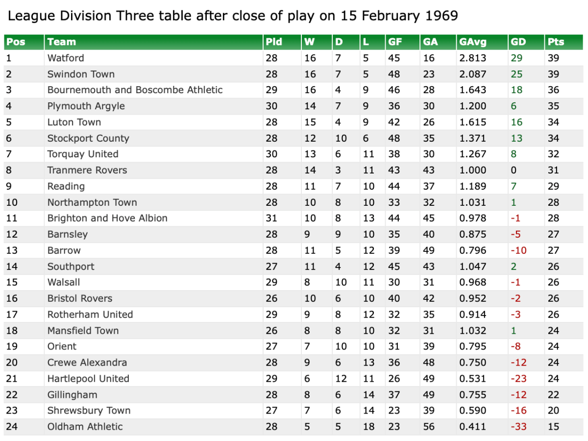 15th February 1969- Division Three, Torquay United 2 Watford 1 Sunday Mirror, 16 Feb 1969 Sunday People, 16 Feb 1969 Watford Observer match report https://www.soccerbase.com/matches/results.sd?date=1969-02-15 https://www.11v11.com/league-tables/league-division-three/15-february-1969/ Share this: Share on X (Opens in new window) X Share on Facebook (Opens in new window) Facebook