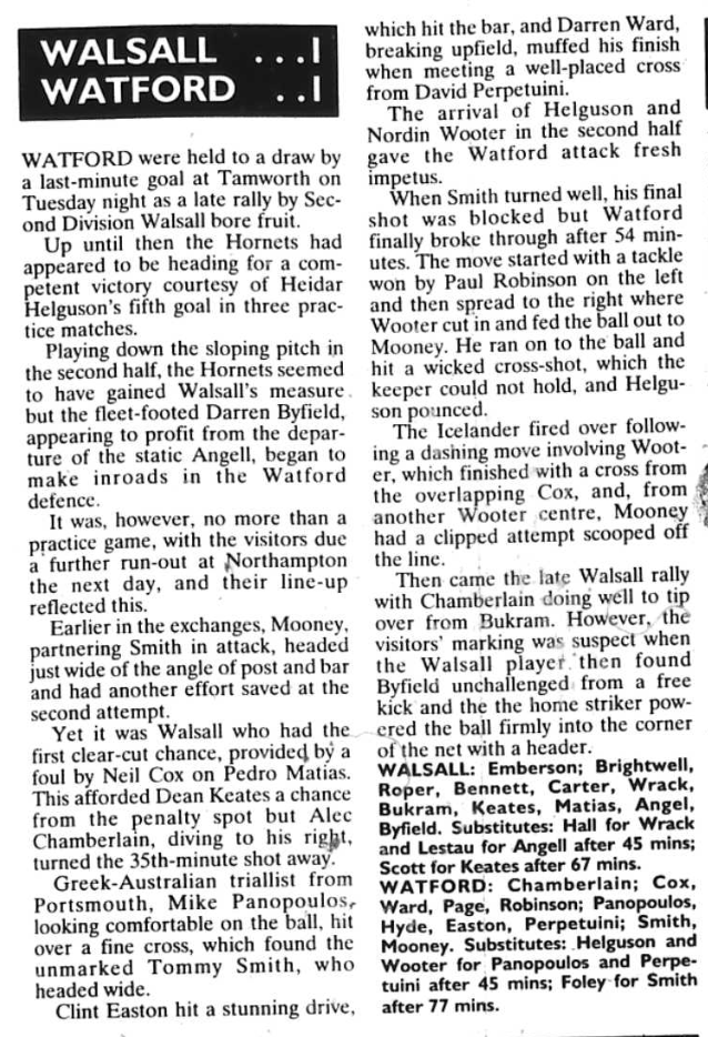 1st August 2000- Friendly, Walsall 1 Watford 1 (played at The Lamb Ground, Tamworth) Leave a Reply 19th August 2000-New Division One, Watford 1 Barnsley 0 Watford Observer, 4 Aug 2000 Share this: Click to share on X (Opens in new window) X Click to share on Facebook (Opens in new window) Facebook