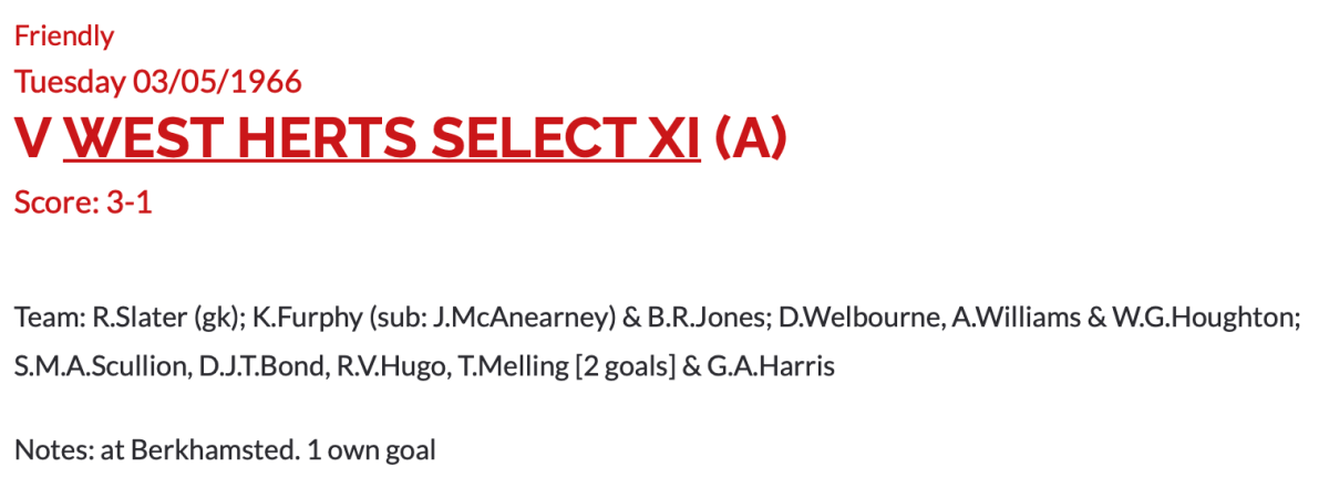 3rd May 1966- Friendly, West Herts Select XI 1 Watford 3 (played at Berkhamsted Town) https://www.watfordfcarchive.co.uk/fixture/1966-05-03 Watford Observer match report Share this: Share on X (Opens in new window) X Share on Facebook (Opens in new window) Facebook